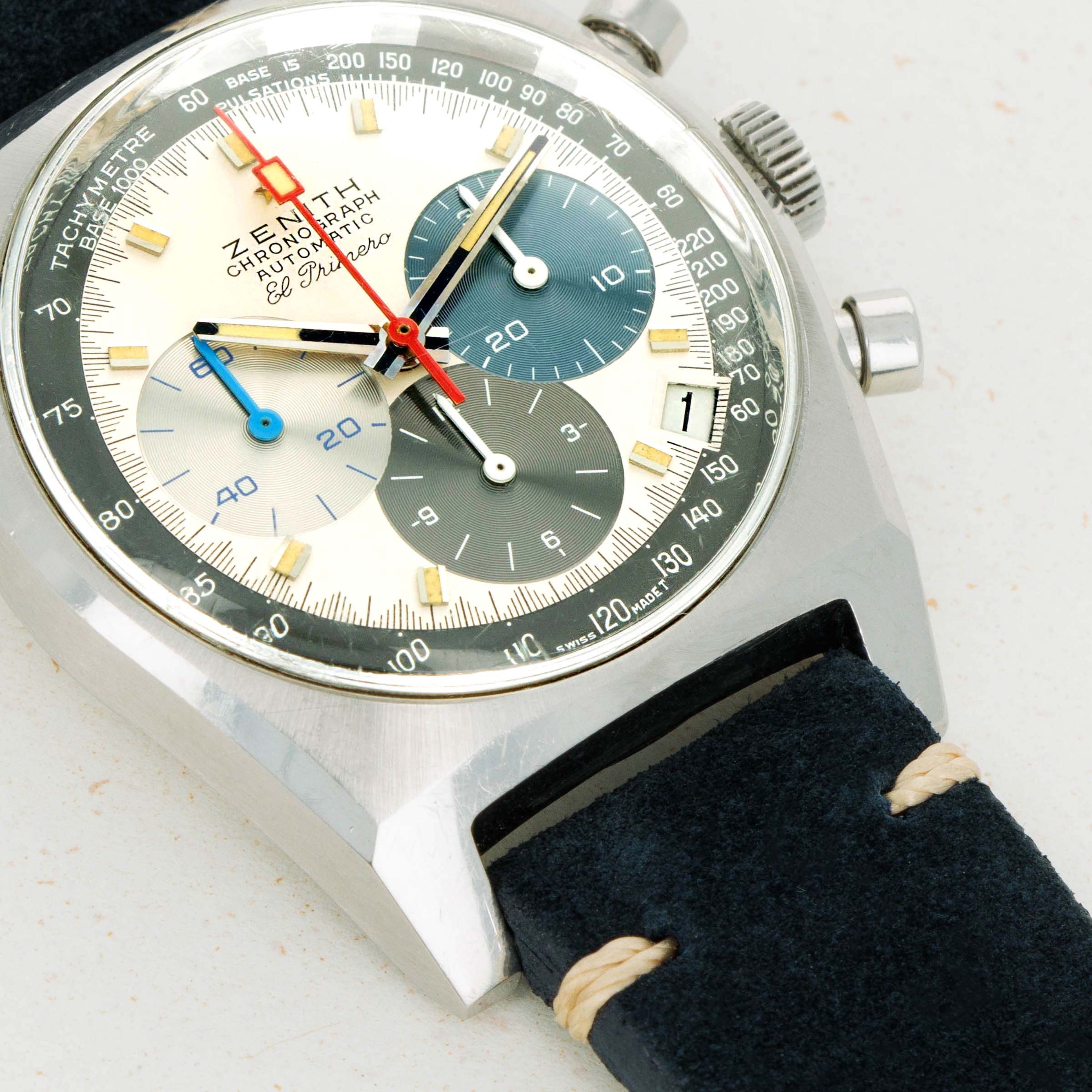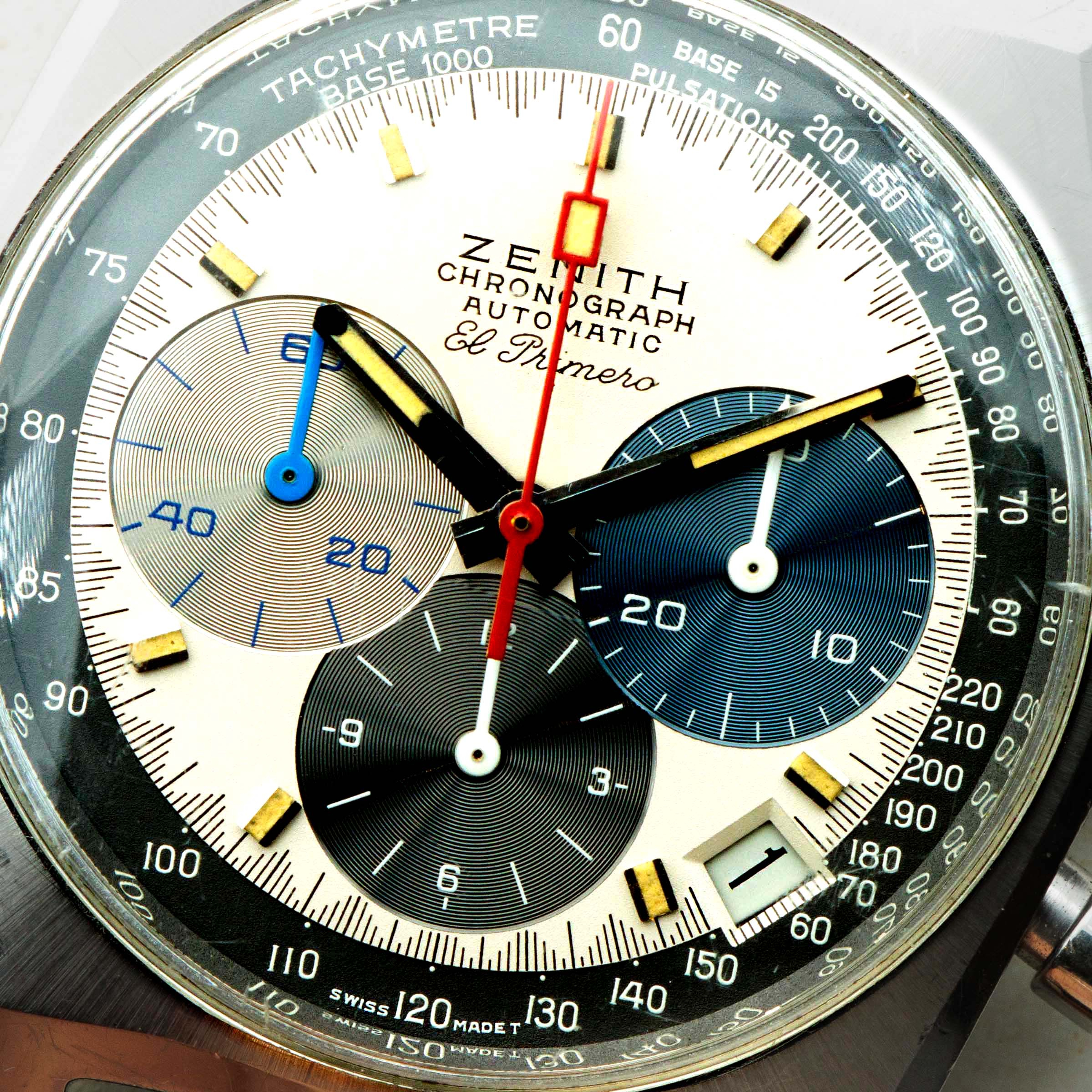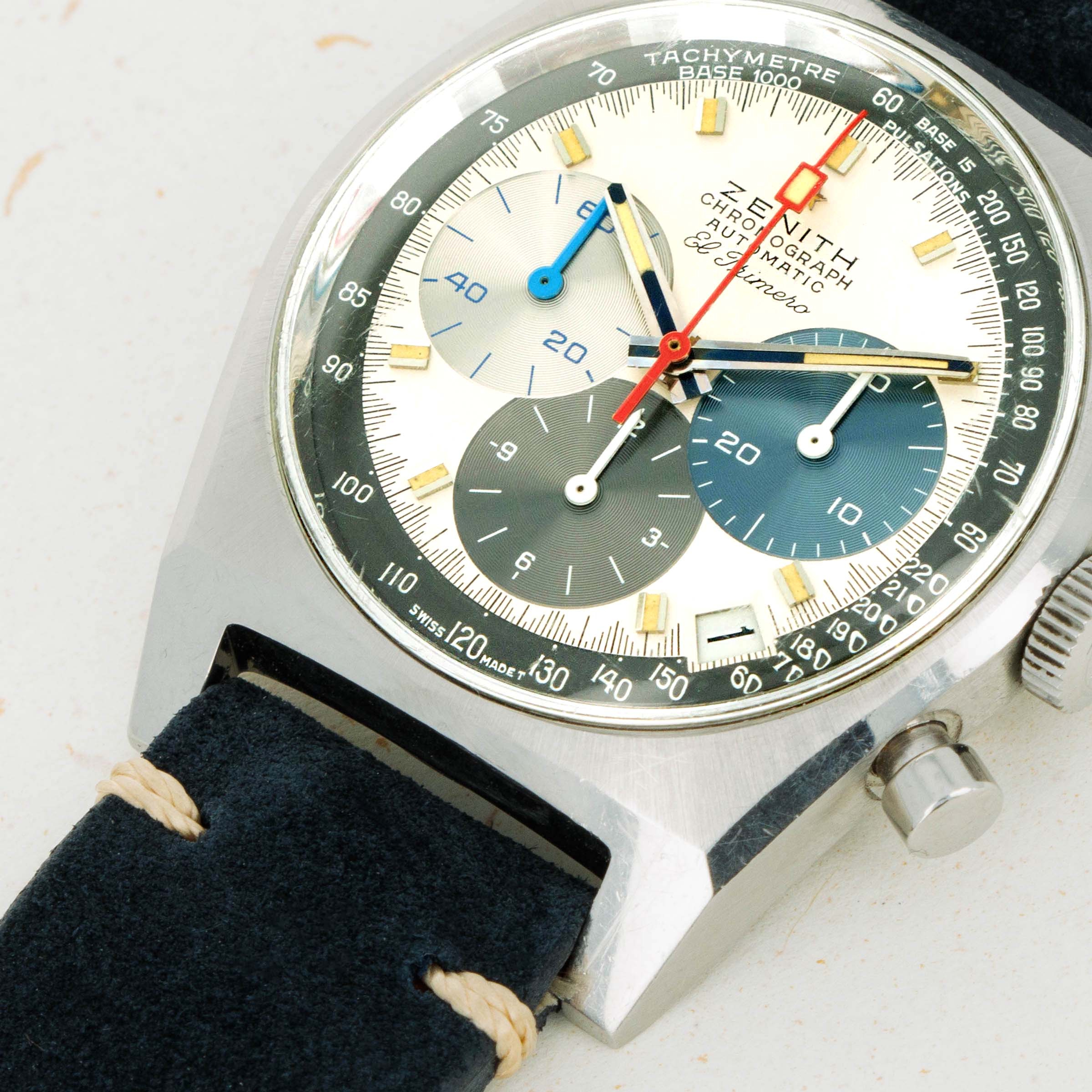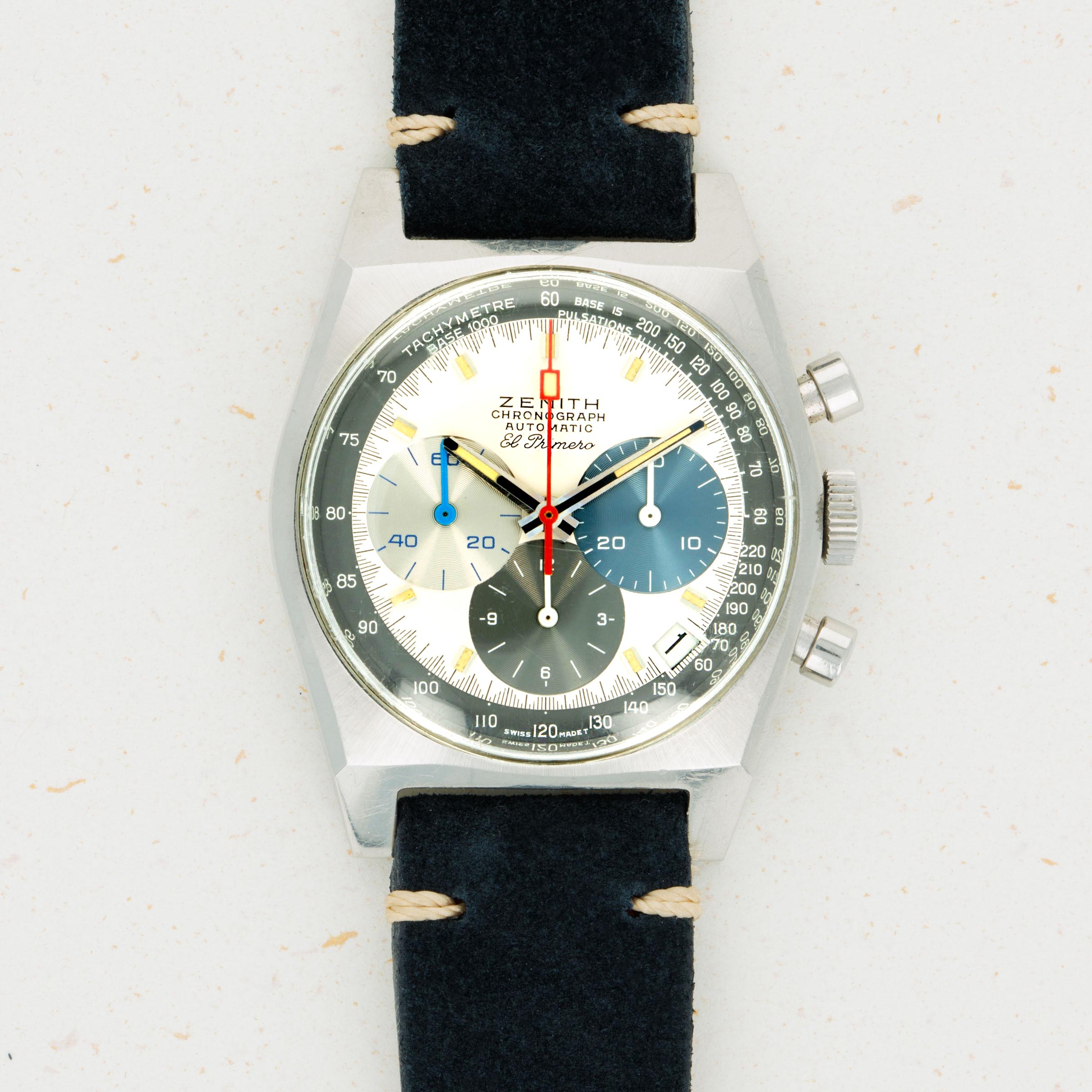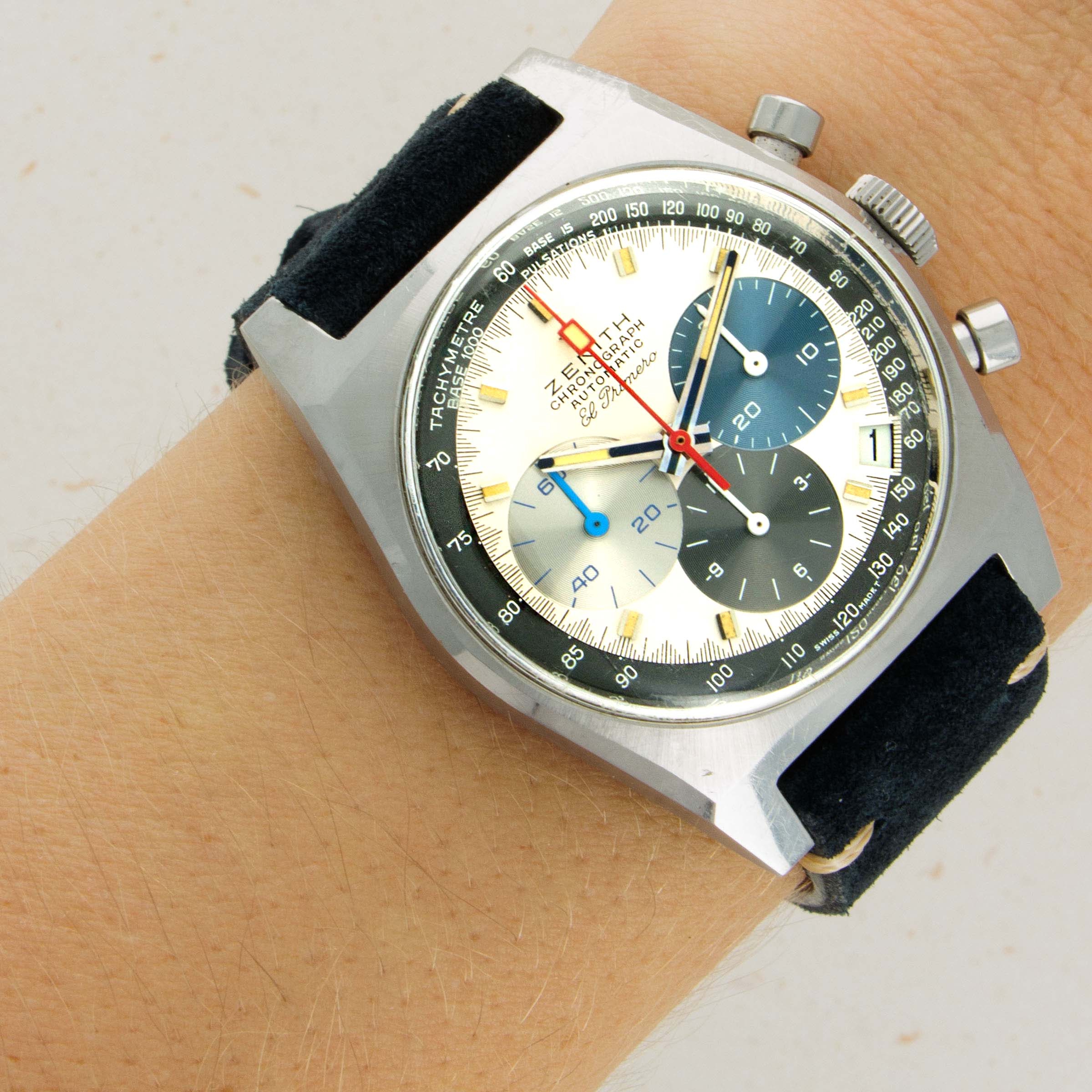Arguably one of the most famous chronograph makers in all of horology, Zenith is best-known for their El Primero automatic chronograph movement. From its status as one of the first automatic chronograph movements ever made (depending on who you ask) and the base movement to feature within the second-generation Rolex Daytona, the El Primero is certainly a modern-day icon. Launched in 1969, its incredible hi-beat rate, amazing accuracy and technical prowess ensured that any watch it was inside was one of the best chronographs money could buy. One of those watches was Zenith's own A3817, the watch that we have here. Debuting in 1971 and with only 1000 pieces produced, the A3817 crossed the lines between two of Zenith’s other iconic El Primero powered models, the sportier A384 and the classier A386, with it donning one of the model’s cases and the other’s dial. Featuring the A384’s sportier stainless-steel tonneau-shaped case with sharp polished bevels, a thin faceted bezel and pump-style pushers, the A3817 was immediately distinctive from other watchmaker’s timepieces during that period, while still fitting in with the aesthetics of the time. Featuring the A386’s classier dial, the A3817 sports a beautiful silver dial with three overlapping multi-colored subdials; navy, black and light grey. With its intriguing blend of colors making its way onto the A3817’s hands, inscriptions and applied indices, the A3817 is immediately distinctive on the outside, just like it is on the inside – a fitting tribute to its status as an exceedingly rare timepiece that collectors cherish.