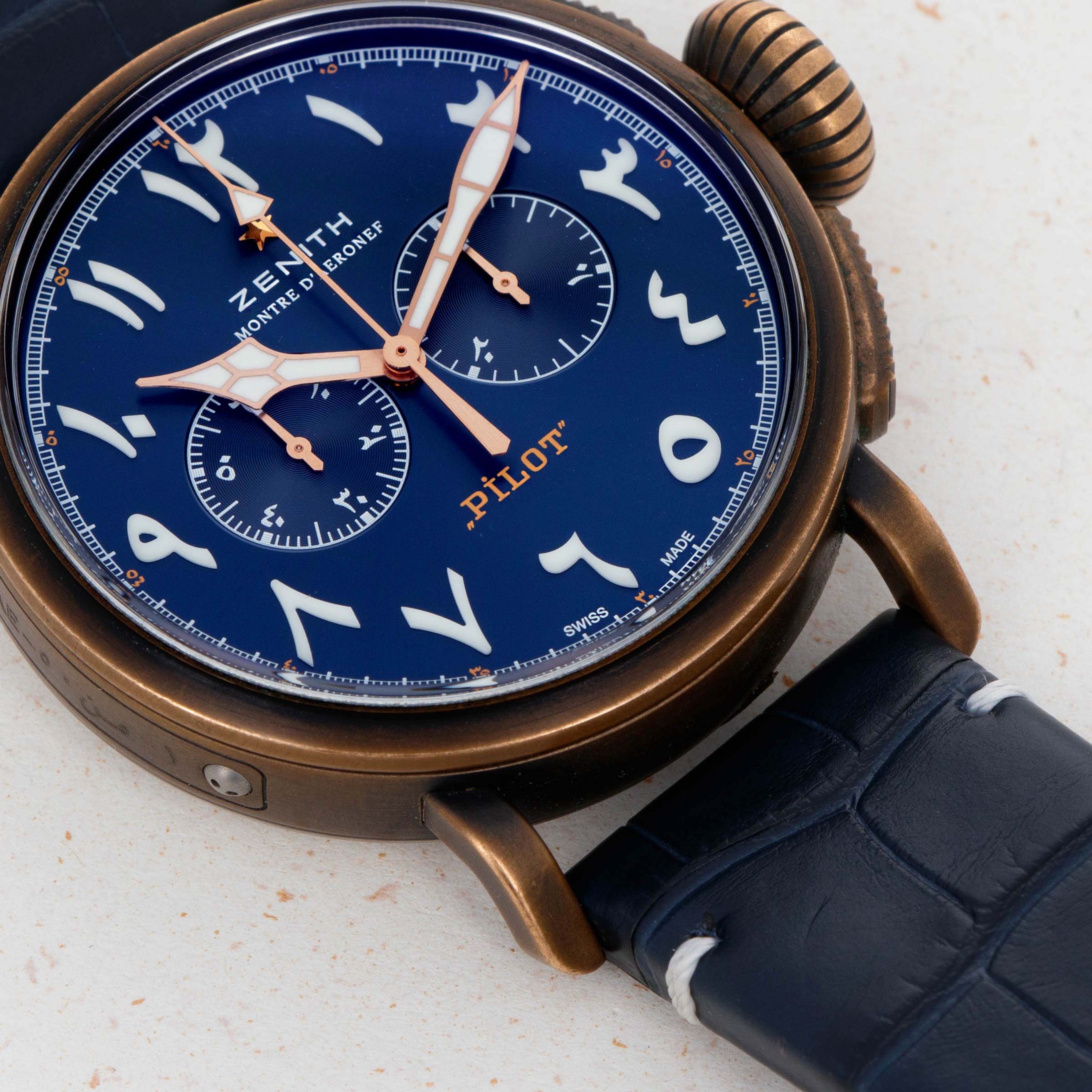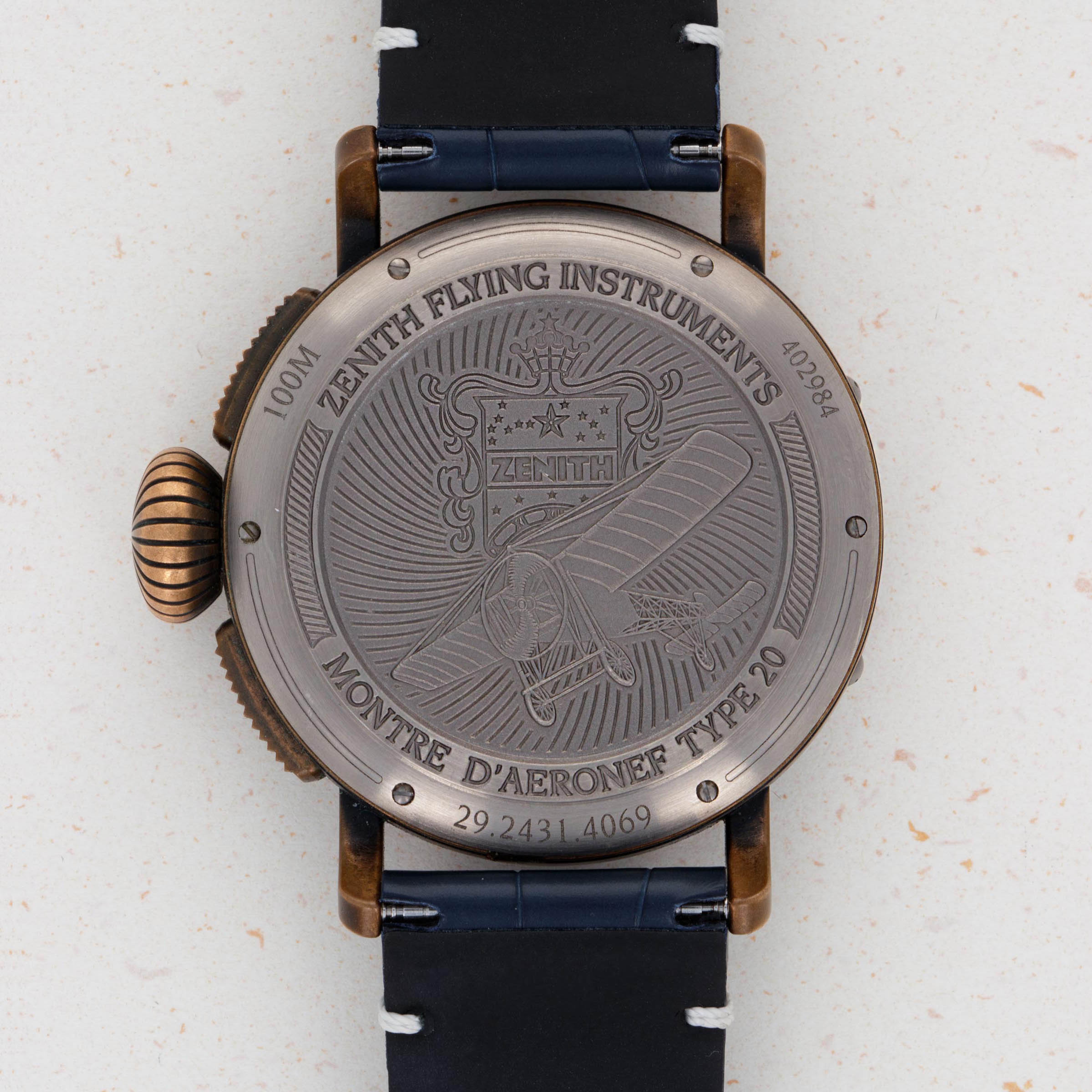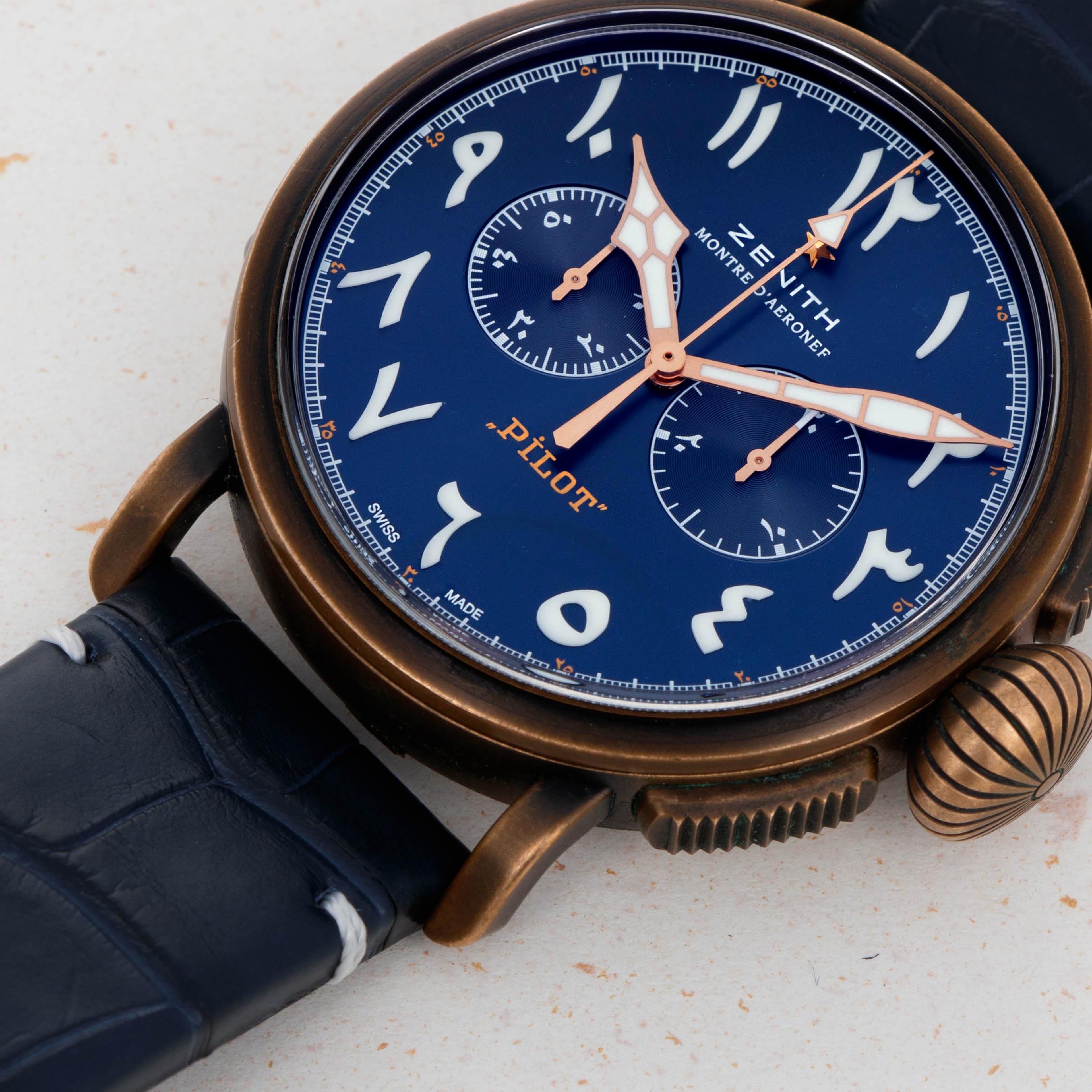 Launched in 2012, the Zenith Pilot Montre D’Aéronef Type 20 is a heritage-inspired pilot’s watch based on the converted pocketwatches of old. With its large 45mm diameter, large and rather imposing onion-shaped crown and thick pushers, the Zenith Pilot Montre D' Aeronef Type 20 is a watch that is clearly designed for use while wearing gloves, to make things slightly easier for a pilot wearing their watch as they traverse the skies. Made of bronze and featuring a glossy blue eastern-Arabic dial, this example is a limited edition variant produced for exclusively for the UAE in 2018. With its commemorative caseback, hefty 45mm construction this timepiece is a wonderful reminder of Zenith’s aviator watch history and the strides that have been made in watchmaking since the early days of the mid-century.
