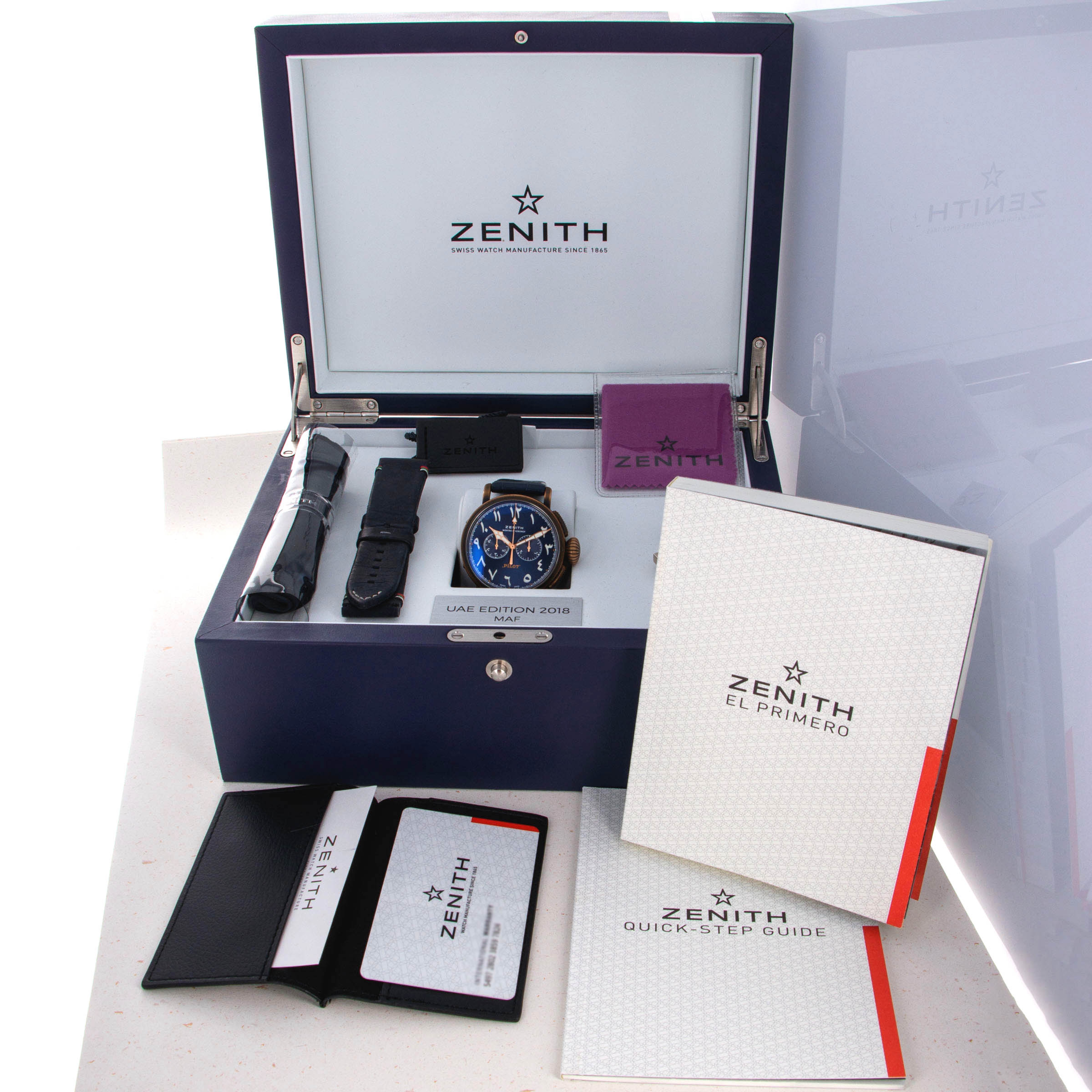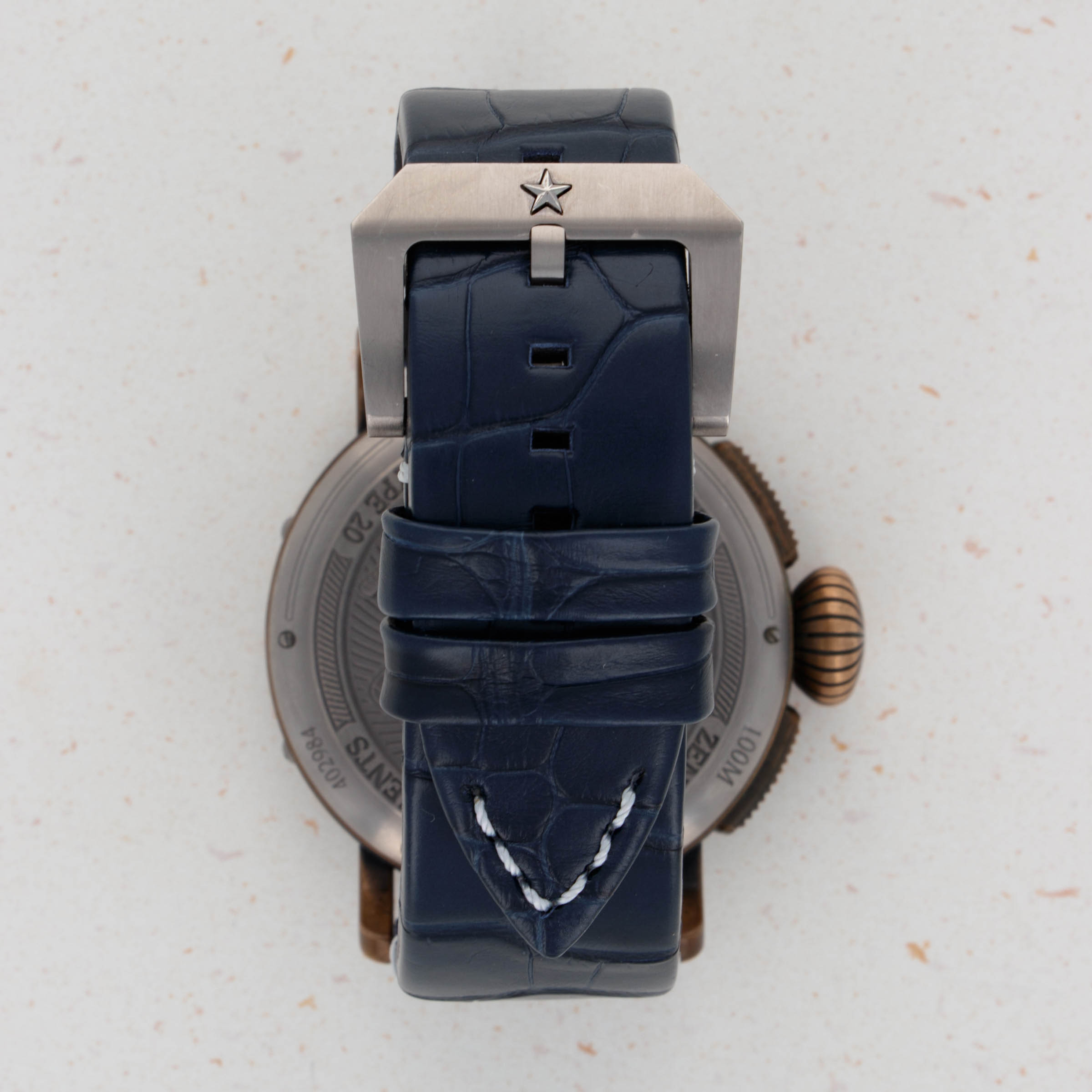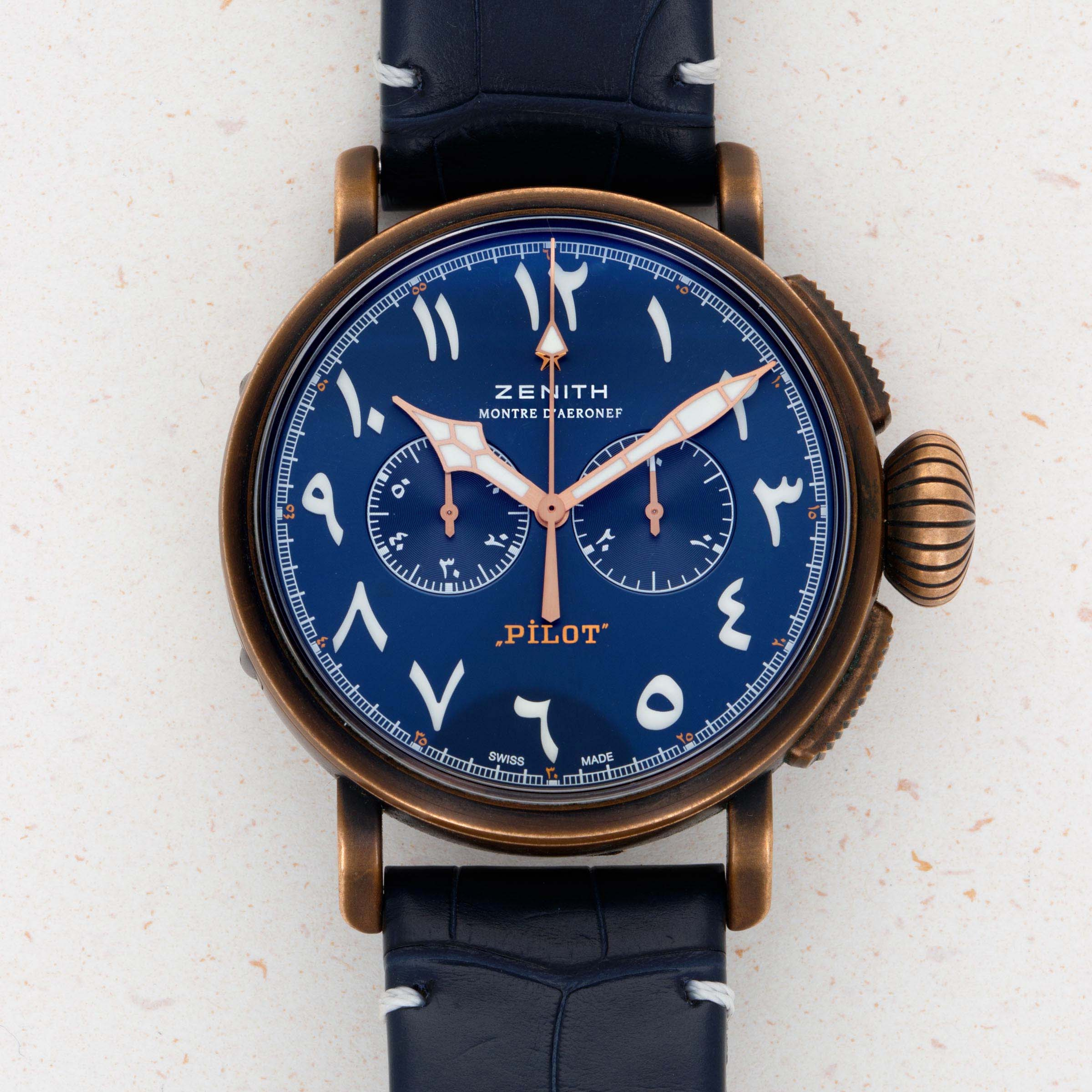 Launched in 2012, the Zenith Pilot Montre D’Aéronef Type 20 is a heritage-inspired pilot’s watch based on the converted pocketwatches of old. With its large 45mm diameter, large and rather imposing onion-shaped crown and thick pushers, the Zenith Pilot Montre D' Aeronef Type 20 is a watch that is clearly designed for use while wearing gloves, to make things slightly easier for a pilot wearing their watch as they traverse the skies. Made of bronze and featuring a glossy blue eastern-Arabic dial, this example is a limited edition variant produced for exclusively for the UAE in 2018. With its commemorative caseback, hefty 45mm construction this timepiece is a wonderful reminder of Zenith’s aviator watch history and the strides that have been made in watchmaking since the early days of the mid-century.