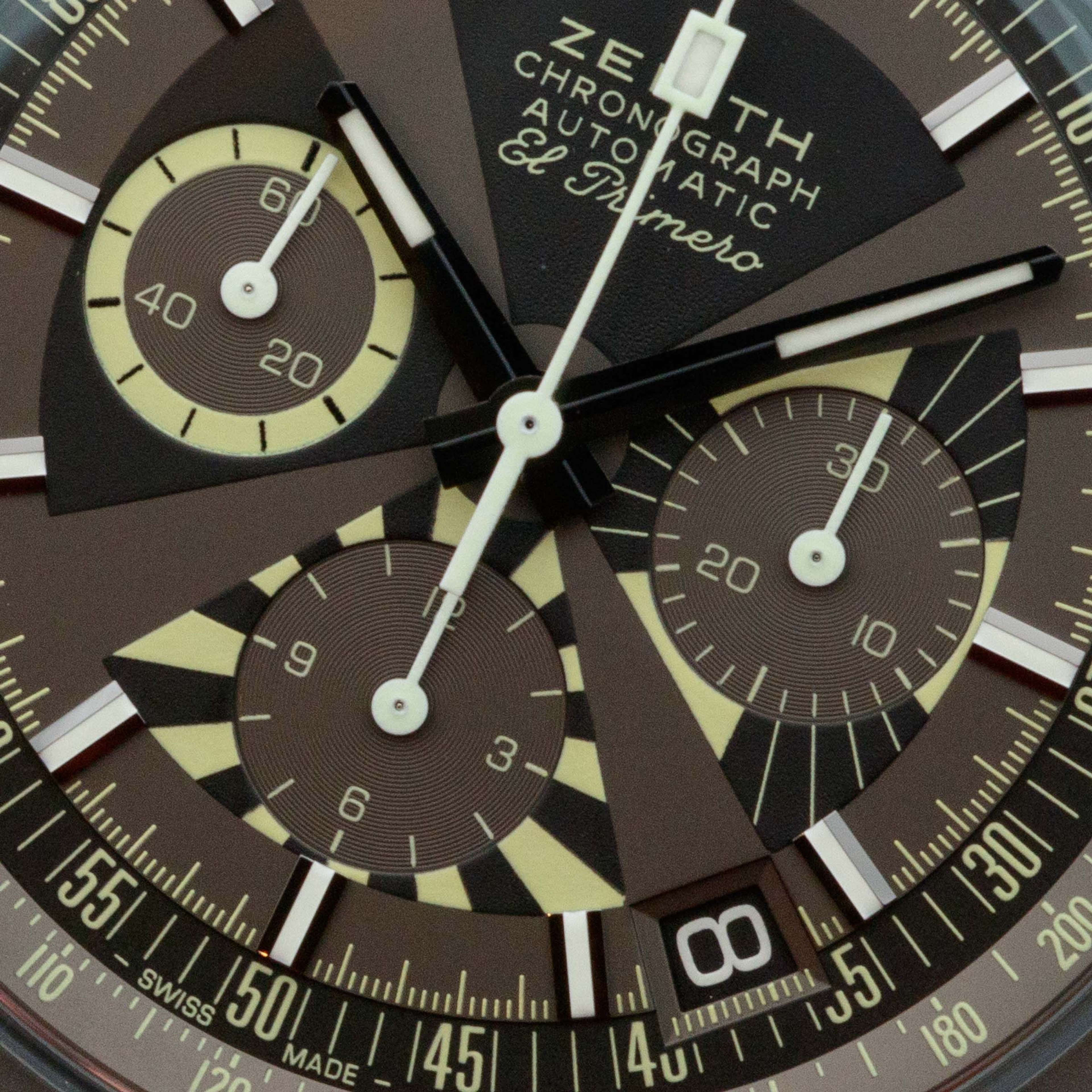 An edgy take on the El Primero's unique history, the Revival uses the same Poker Chip dial design as the G383 with various shades of grey and a generous helping of Super-Luminova to recreate the look of its predecessor.