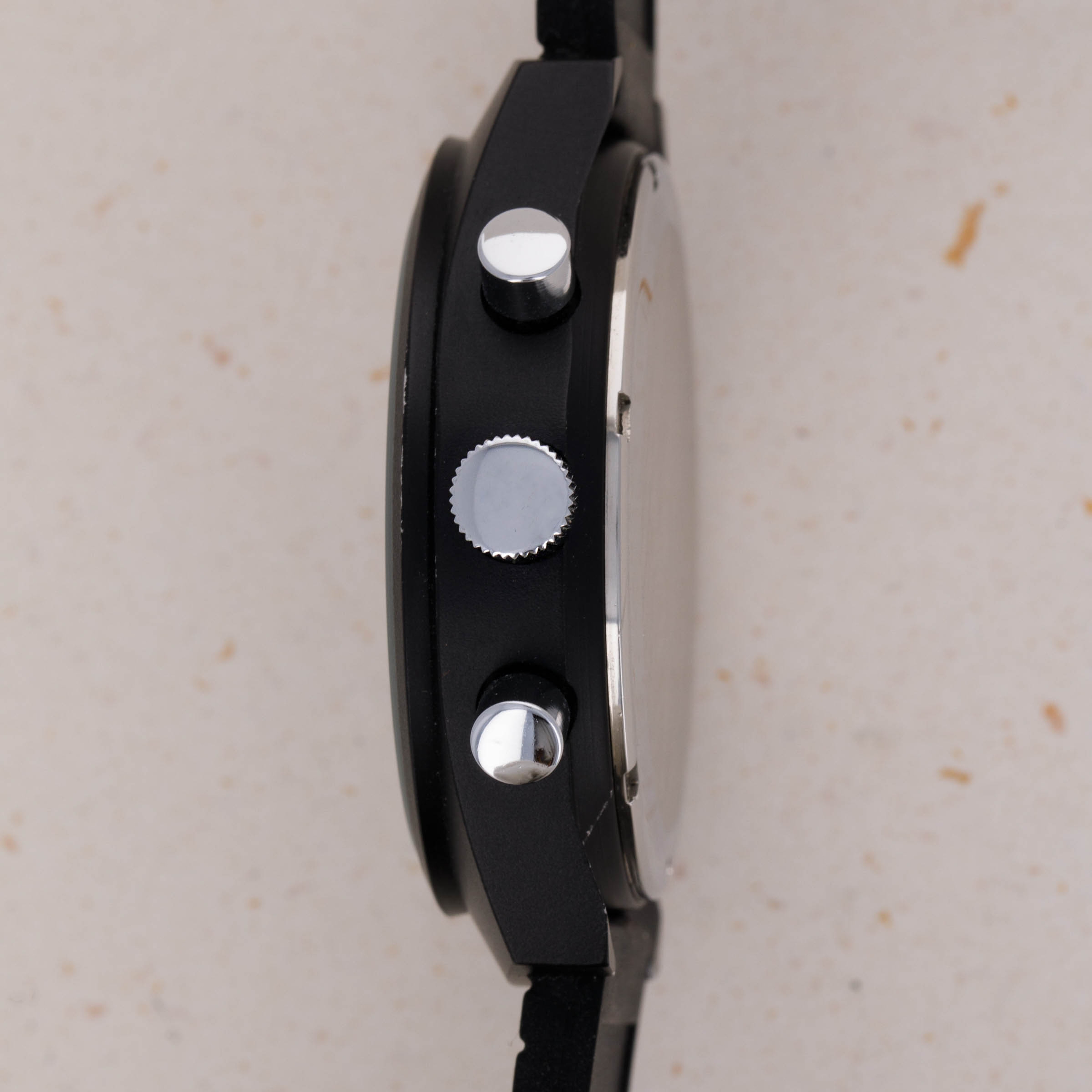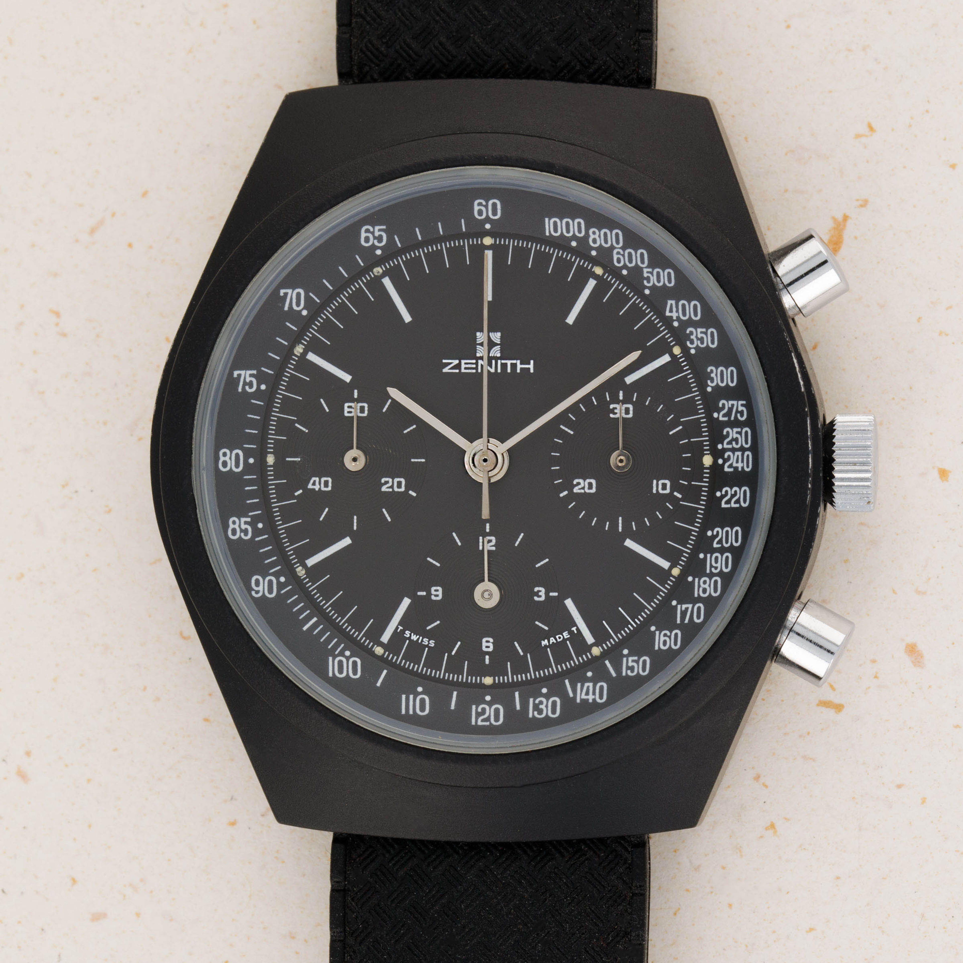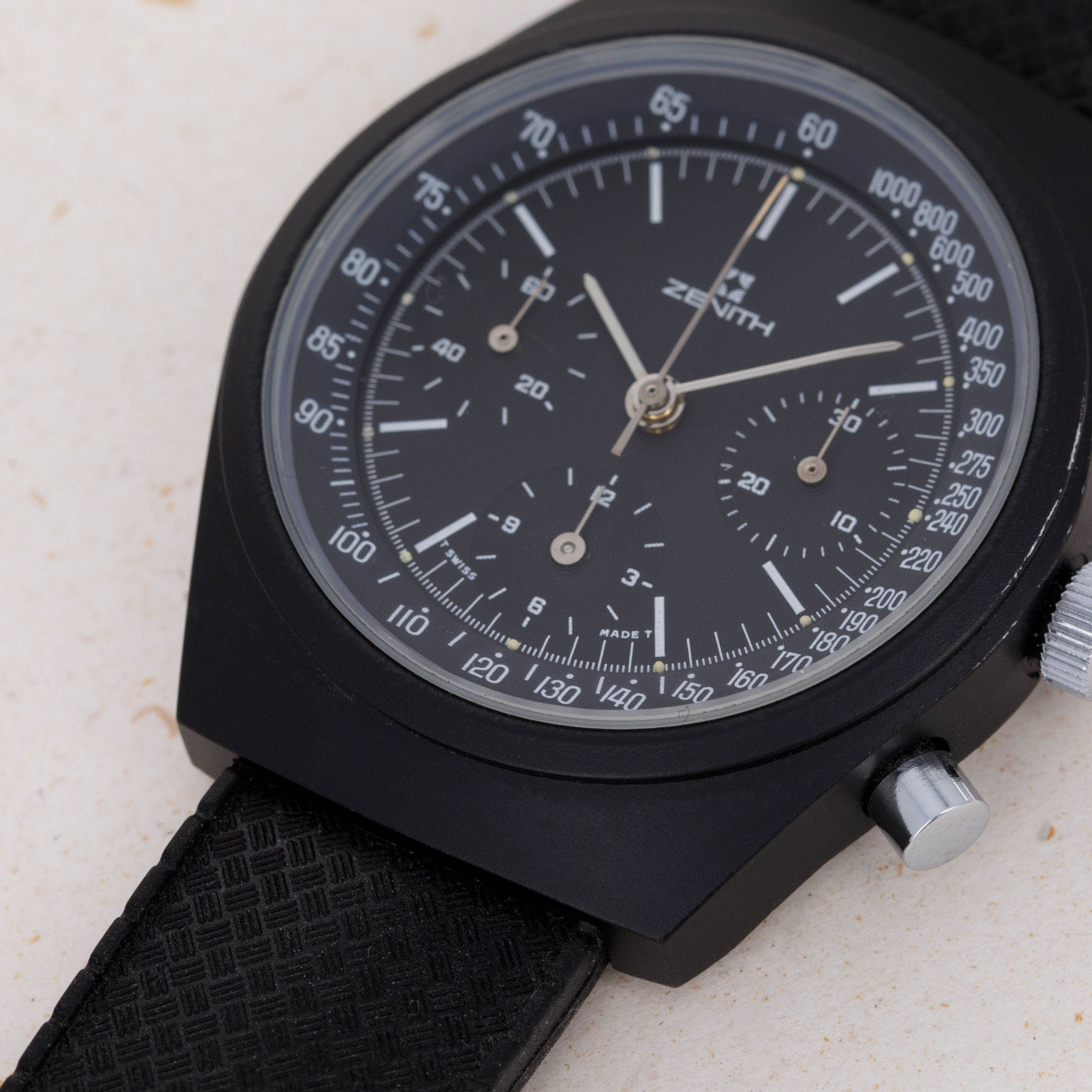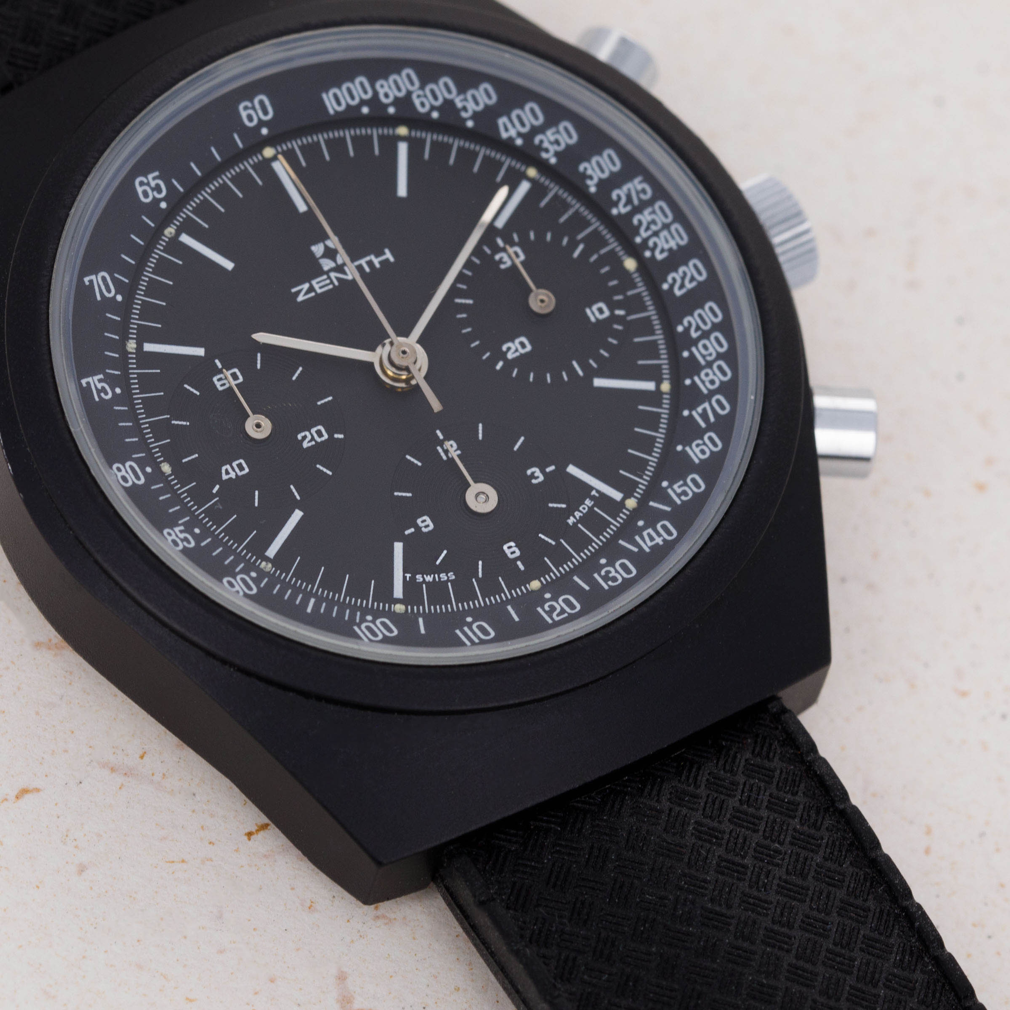 Arguably one of the most famous chronograph makers in all of horology, Zenith is best-known for their El Primero automatic chronograph movement. From its status as one of the first automatic chronograph movements ever made (depending on who you ask) and the base movement to feature within the second-generation Rolex Daytona, the El Primero is certainly a modern-day icon. However, Zenith’s involvement in chronographs certainly pre-dates the El Primero, with the manual-wind cal. 146HP that powers the vintage PVD-coated stainless steel chronograph that we have here a testament to that fact. Identified as an example from the early 1970s as a result of the Zenith logo used on its black dial, this example is powered by the manual-wind cal. 146HP which was produced by Martel. An ebauche whom Zenith acquired in 1960, Martel’s expertise in producing high-class chronograph movements was what Zenith’s development of the El Primero movement relied upon. A prototype of which approx 12 were ever made, the watch provided the inspiration for the Chronometer Revival Shadow that was released in 2020. Offered as a tonneau-shaped 41mm PVD-coated stainless steel timepiece with a sleek black dial and a black rubber strap, this vintage watch aesthetically flies under the radar, yet from a mechanical perspective it retains a strong link to Martel and Zenith’s early days as a chronograph specialist who had only just developed the El Primero and were beginning to ramp up its production.