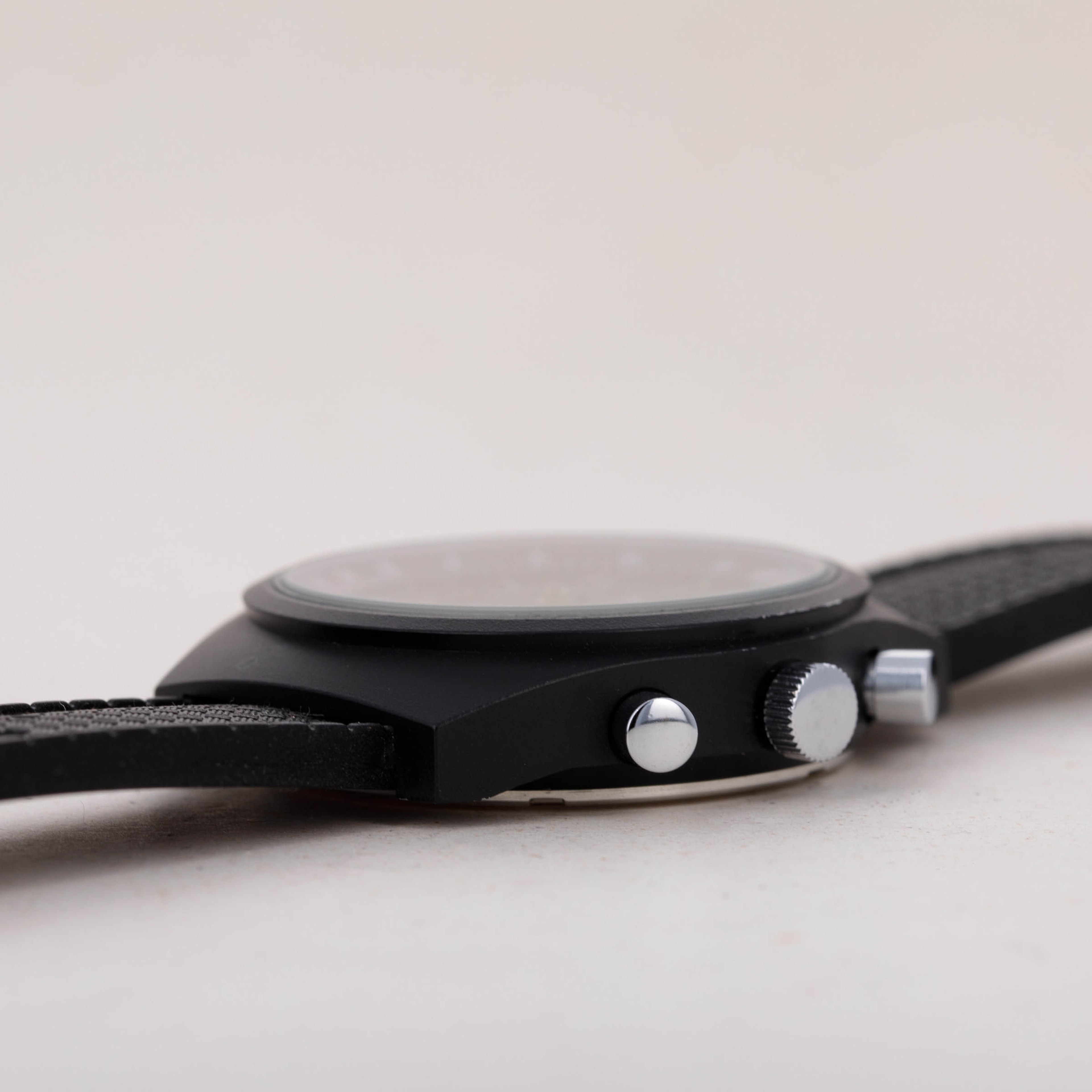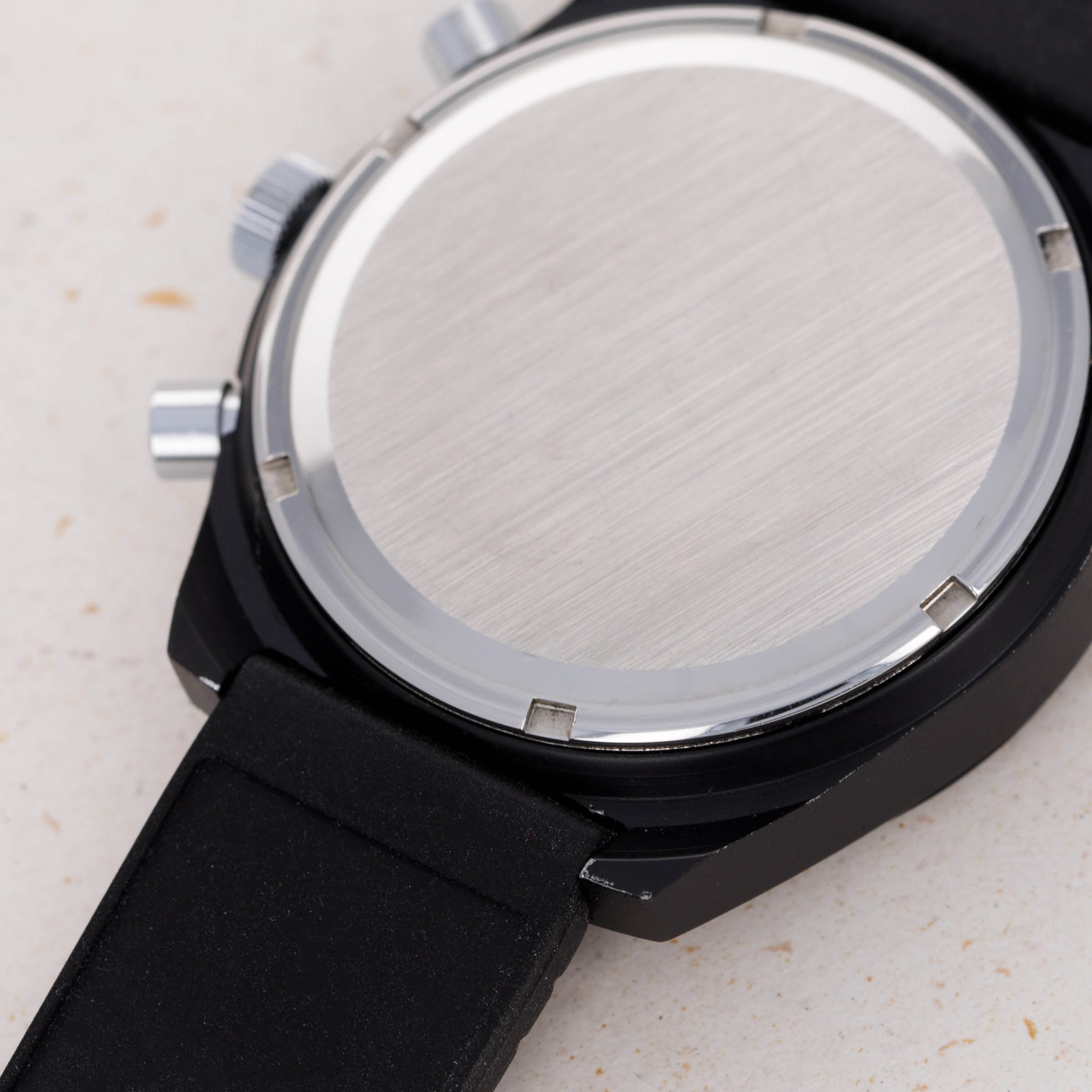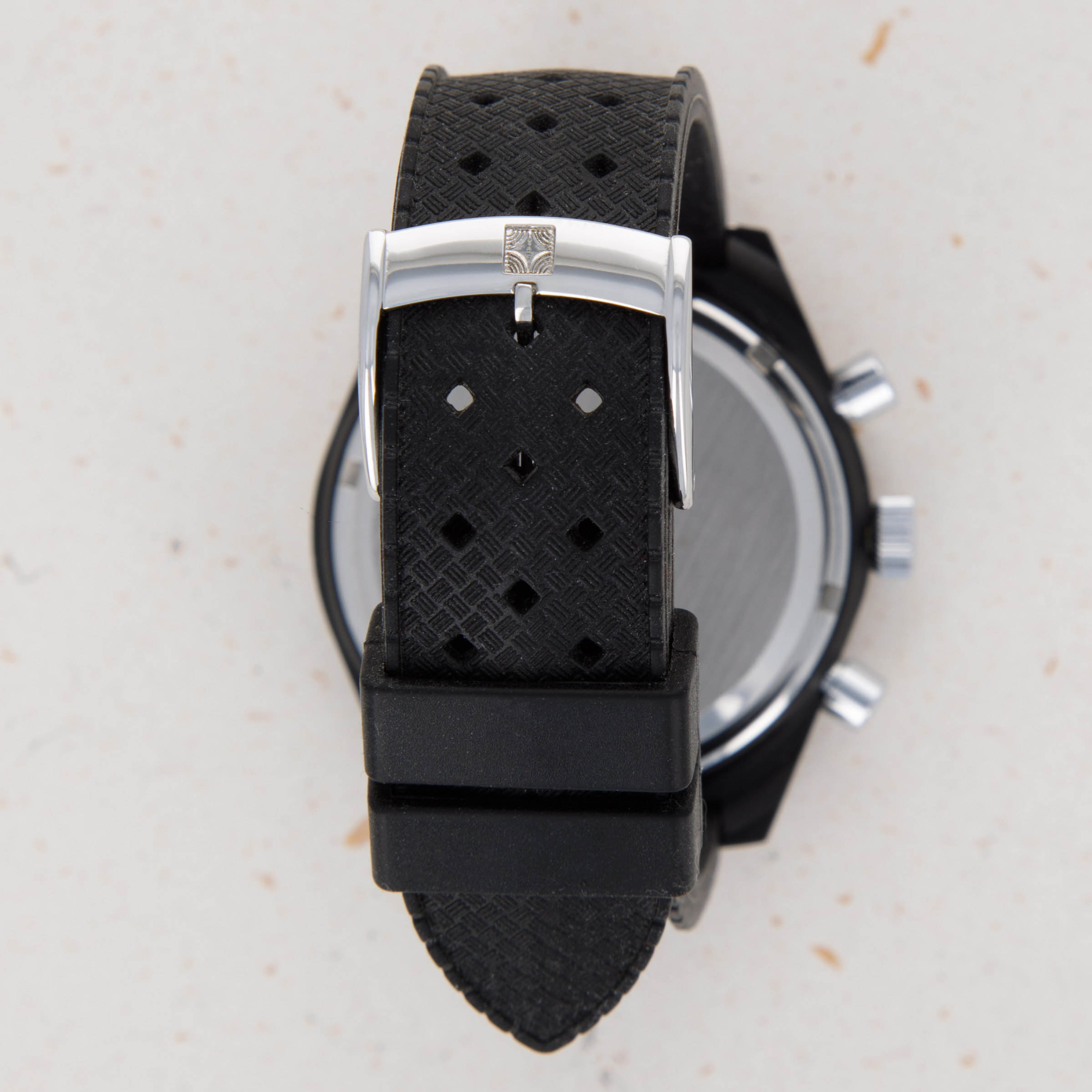 Featuring a PVD-coated stainless steel construction, this tonneau-shaped timepiece would have been huge for the early 1970s with its 41mm diameter, yet it wears smaller than one might expect through its blacked-out finish.
