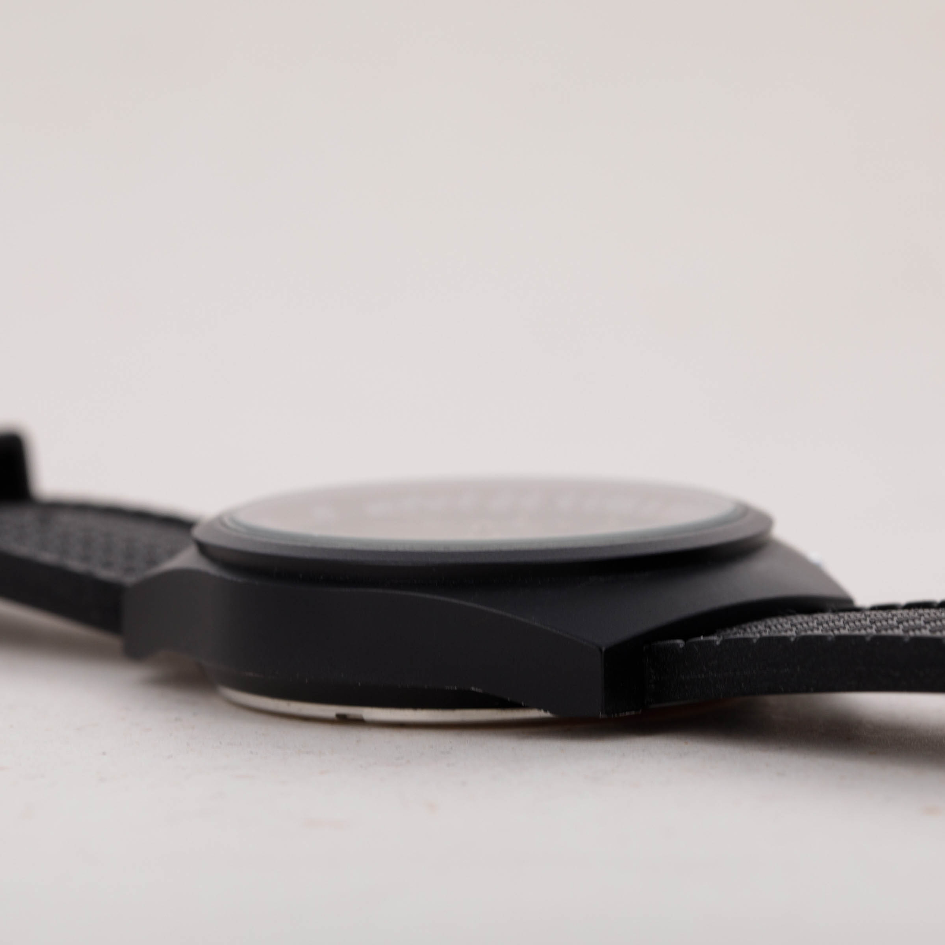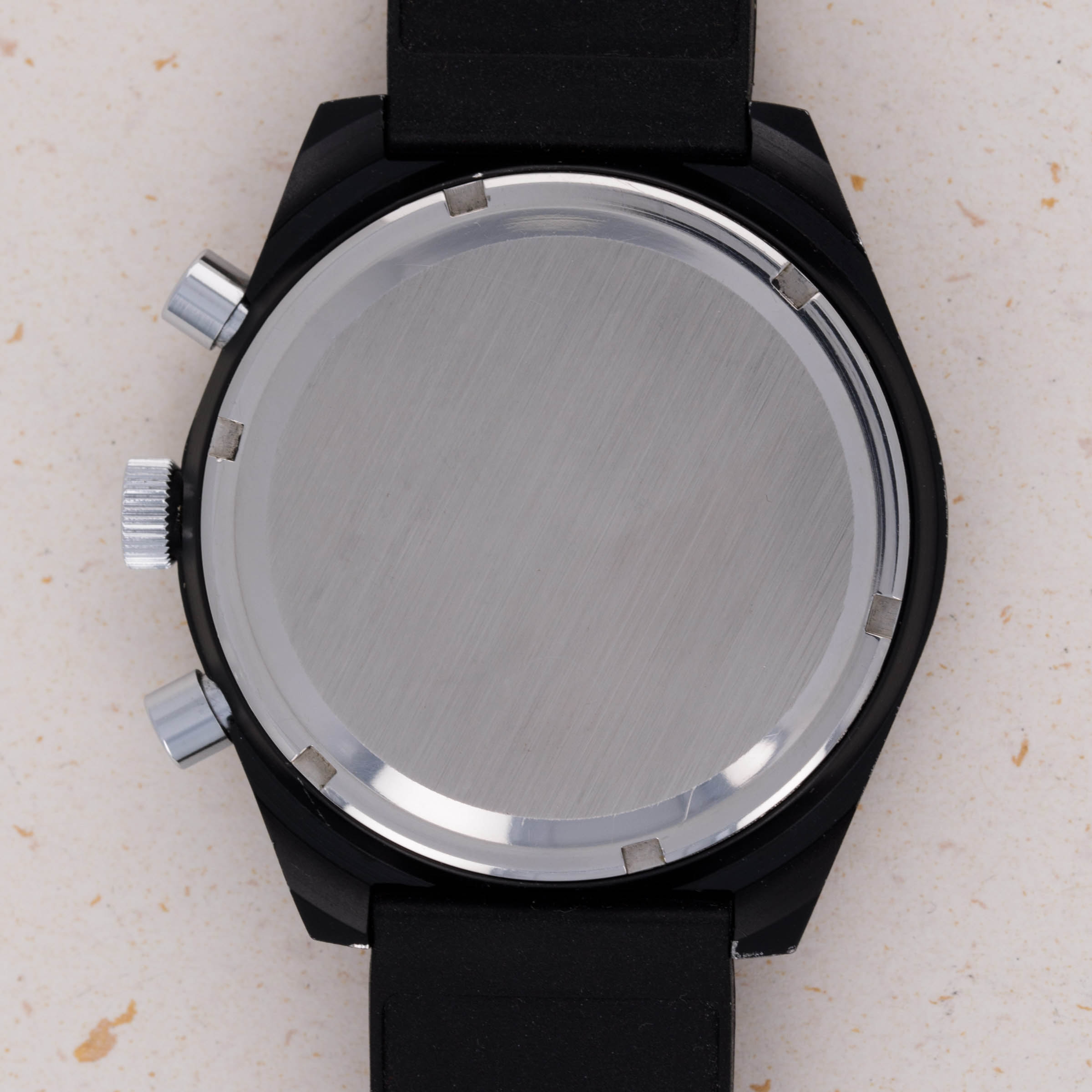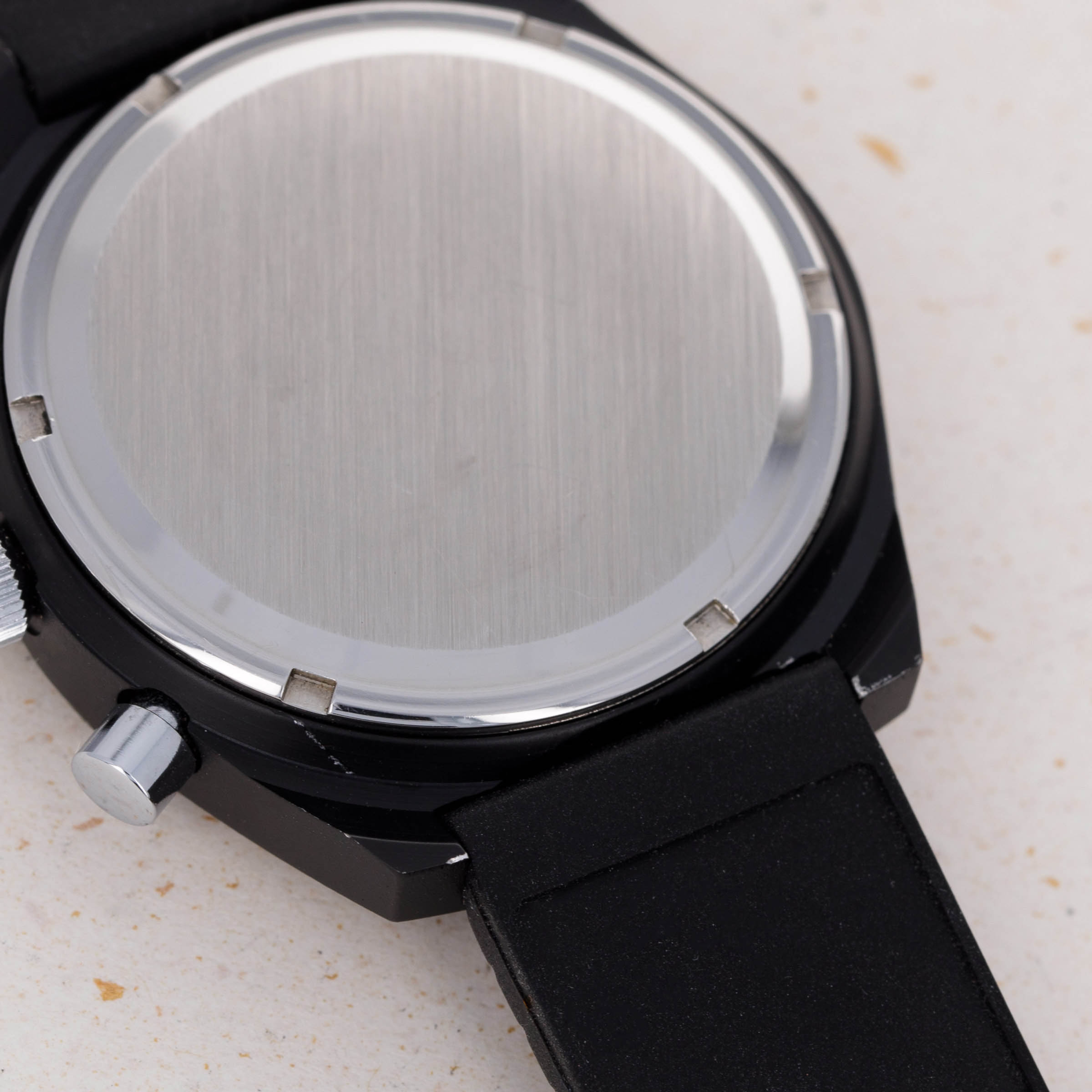 Featuring a PVD-coated stainless steel construction, this tonneau-shaped timepiece would have been huge for the early 1970s with its 41mm diameter, yet it wears smaller than one might expect through its blacked-out finish.
