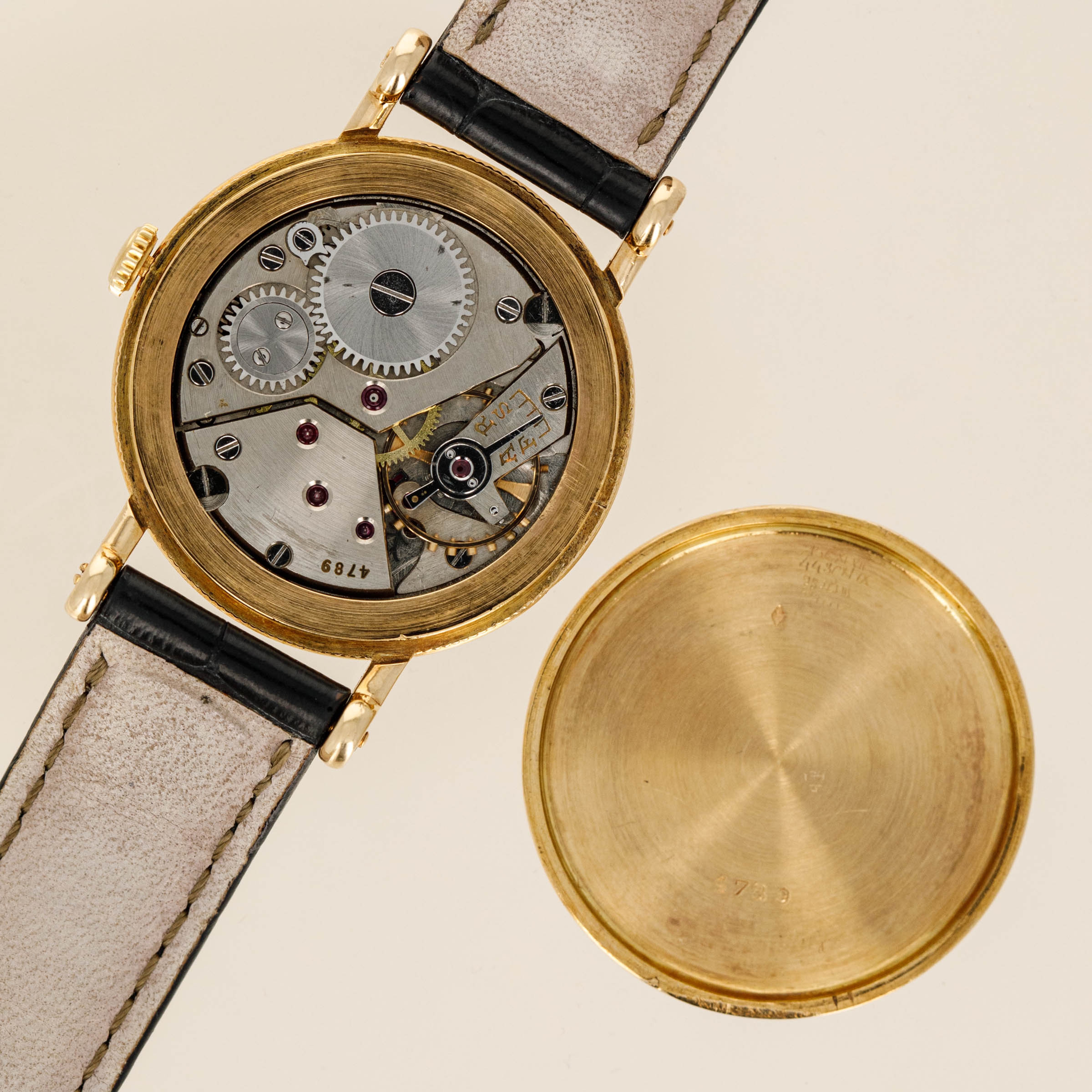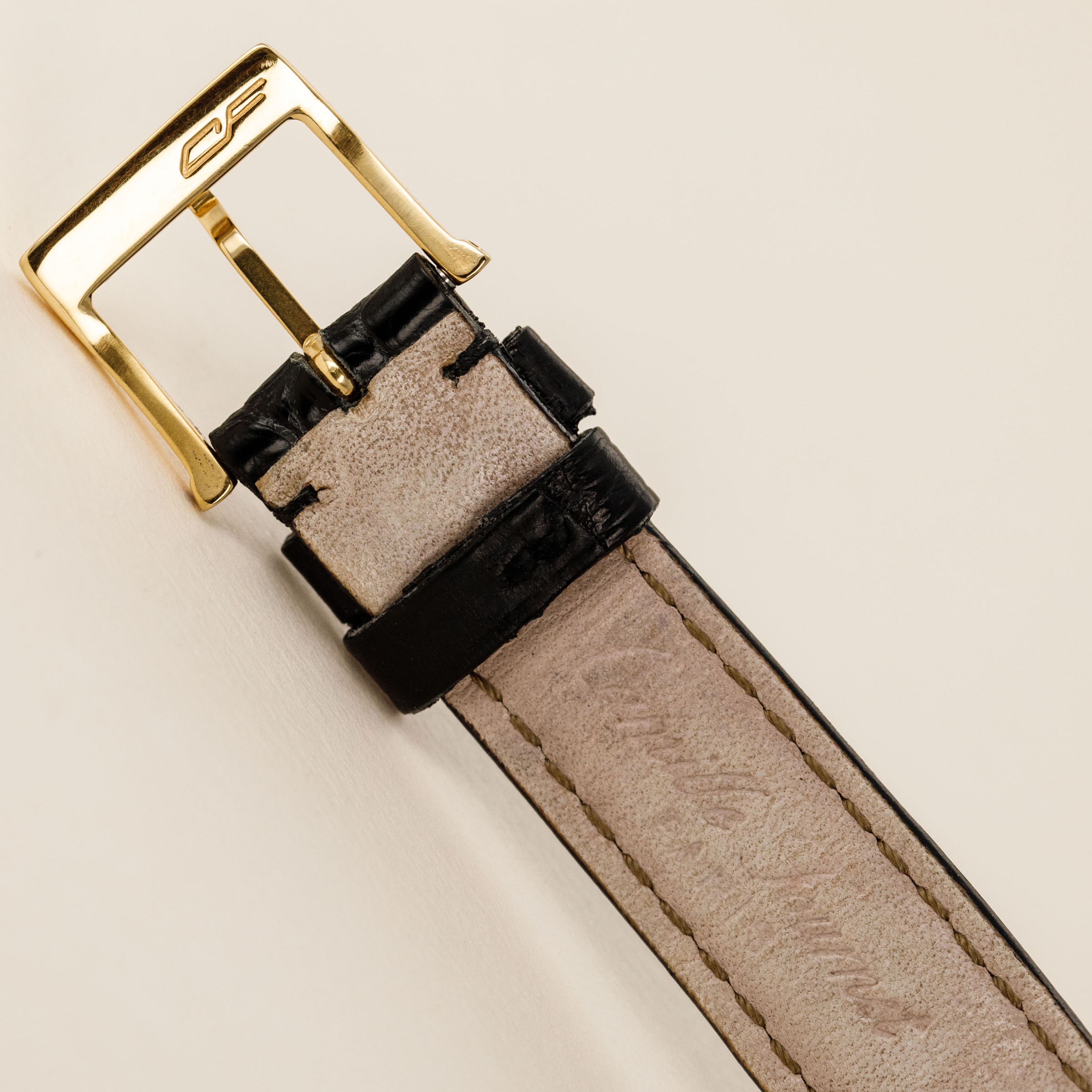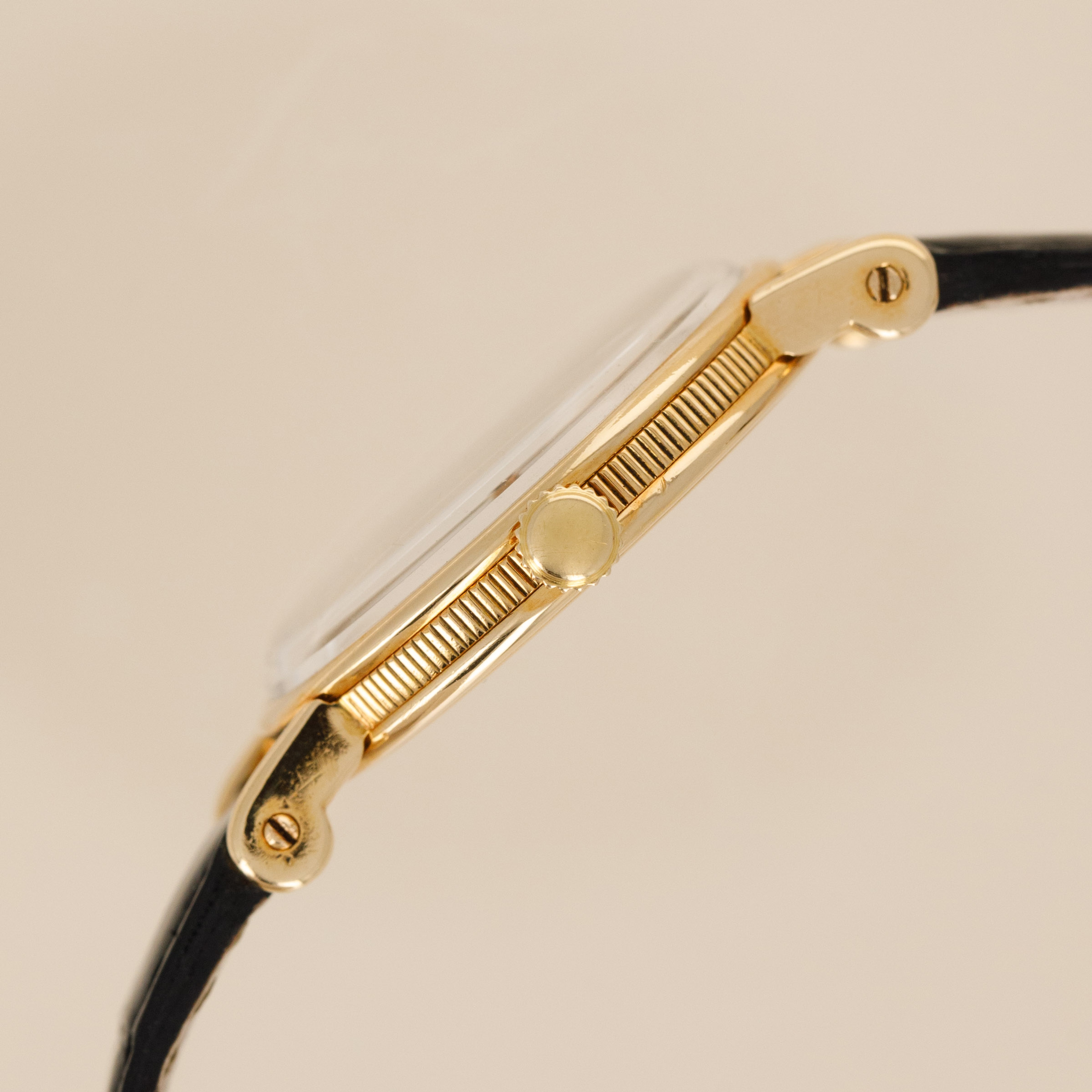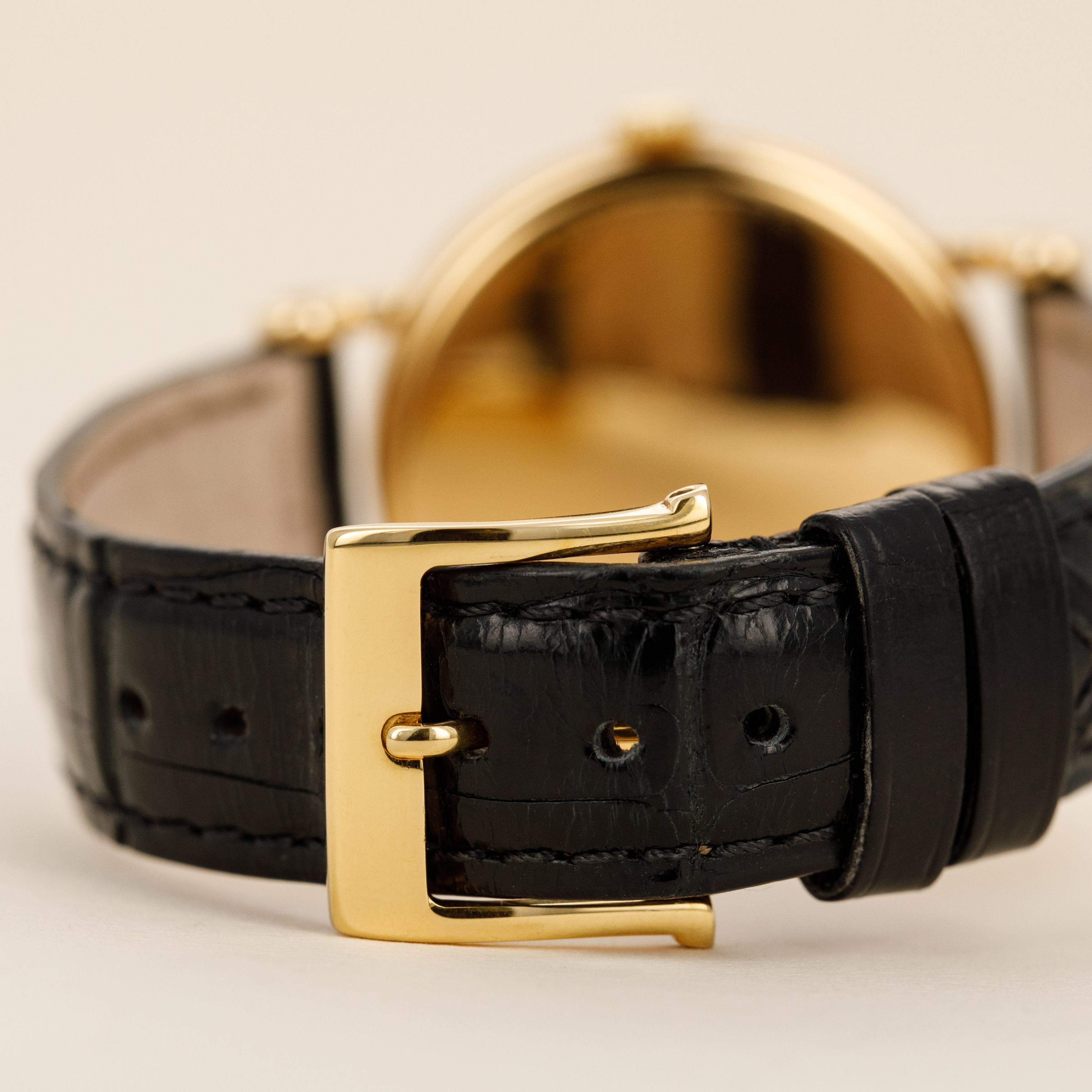 Watch is in overall excellent condition. The yellow gold case shows light scratches and marks, with good definition retained on the coin-edge sides. The case back has fully legible stamps and hallmark. The dial shows some signs of aging on the central guilloché section, and the gold hands have some light marks. Fitted with a black alligator strap and yellow gold-plated buckle.