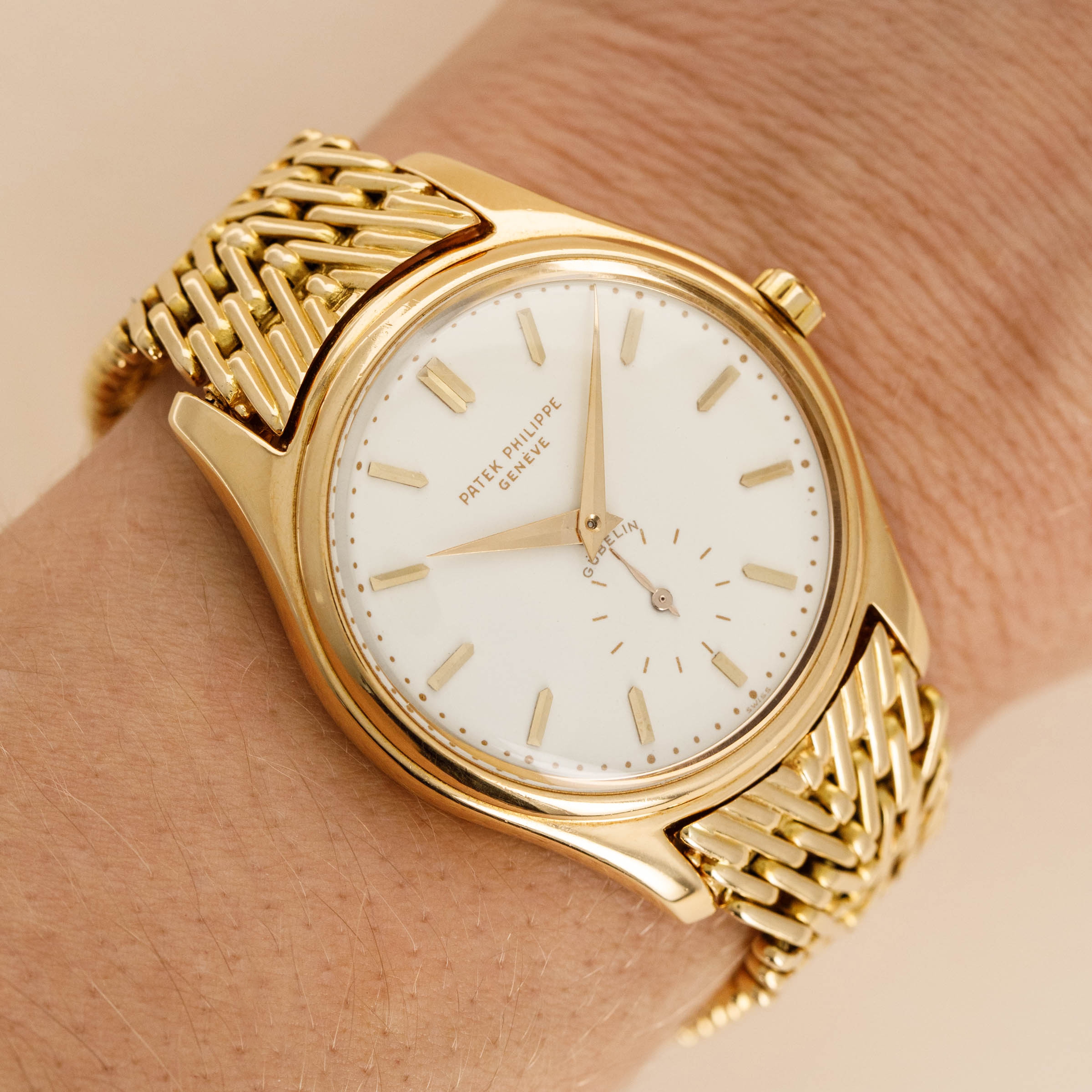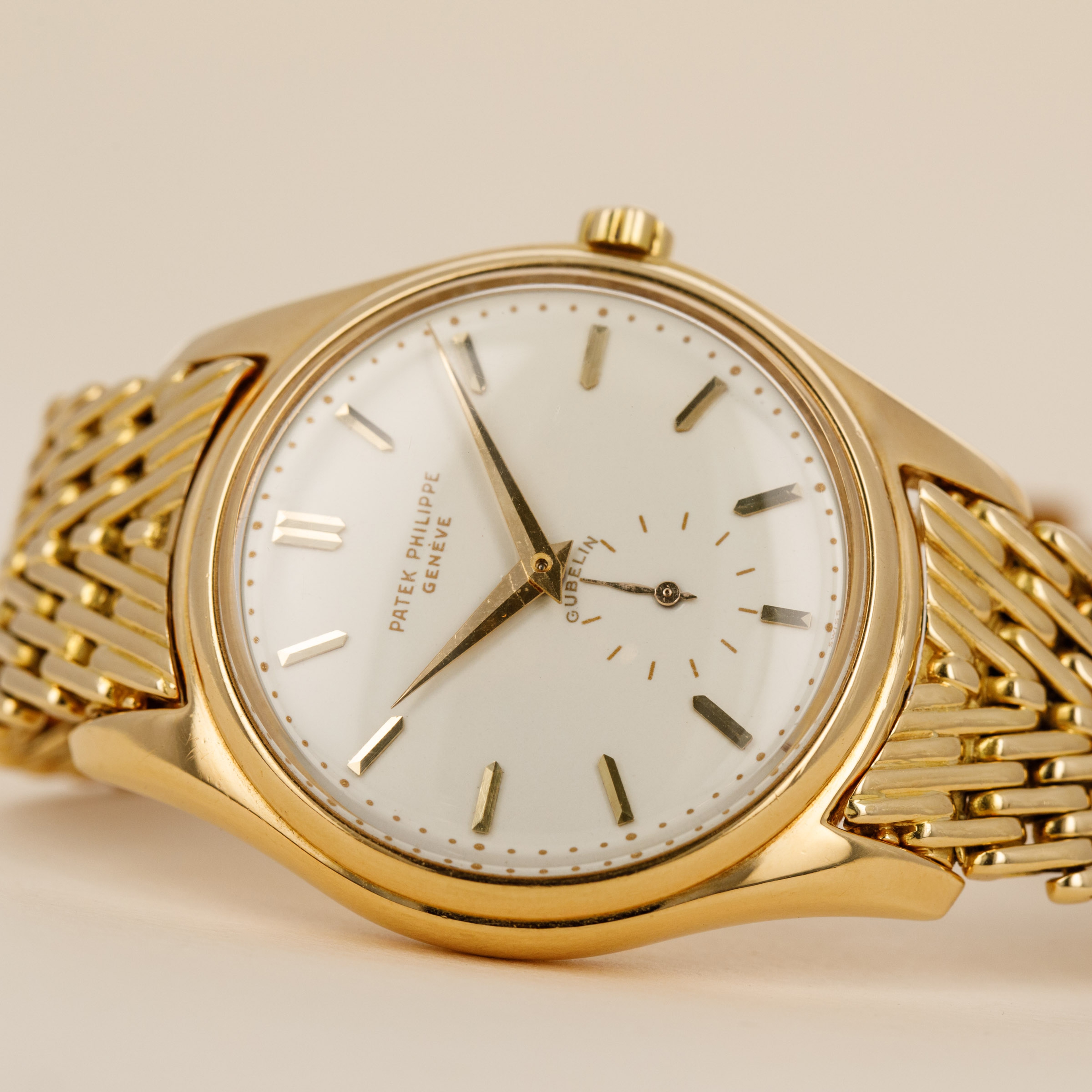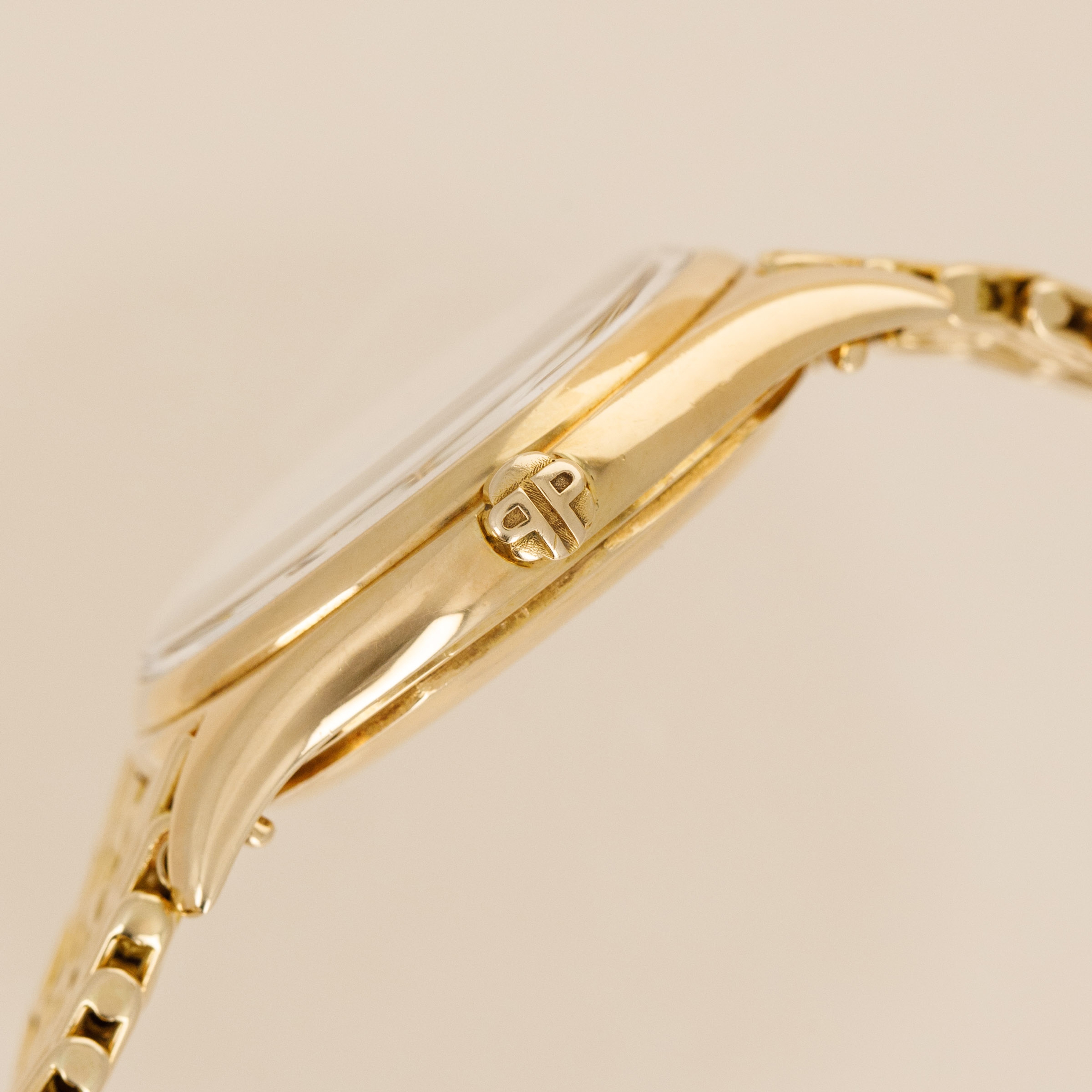 Watch is in overall excellent condition. The yellow gold case shows some light scratches and marks consistent with its vintage, and the Double-P winding crown remains very well defined. The enamel dial is near mint, with crisp text and a clearly visible Gübelin signature. There are no hairlines or visible fissures on the dial surface. The yellow gold hands have some light scratches. It is fitted with a yellow gold GF made Patek Philippe bracelet with signed clasp, showing light surface marks. Fits approximately a 7 1/4” wrist. Comes with its original box and Extract from the Archives.