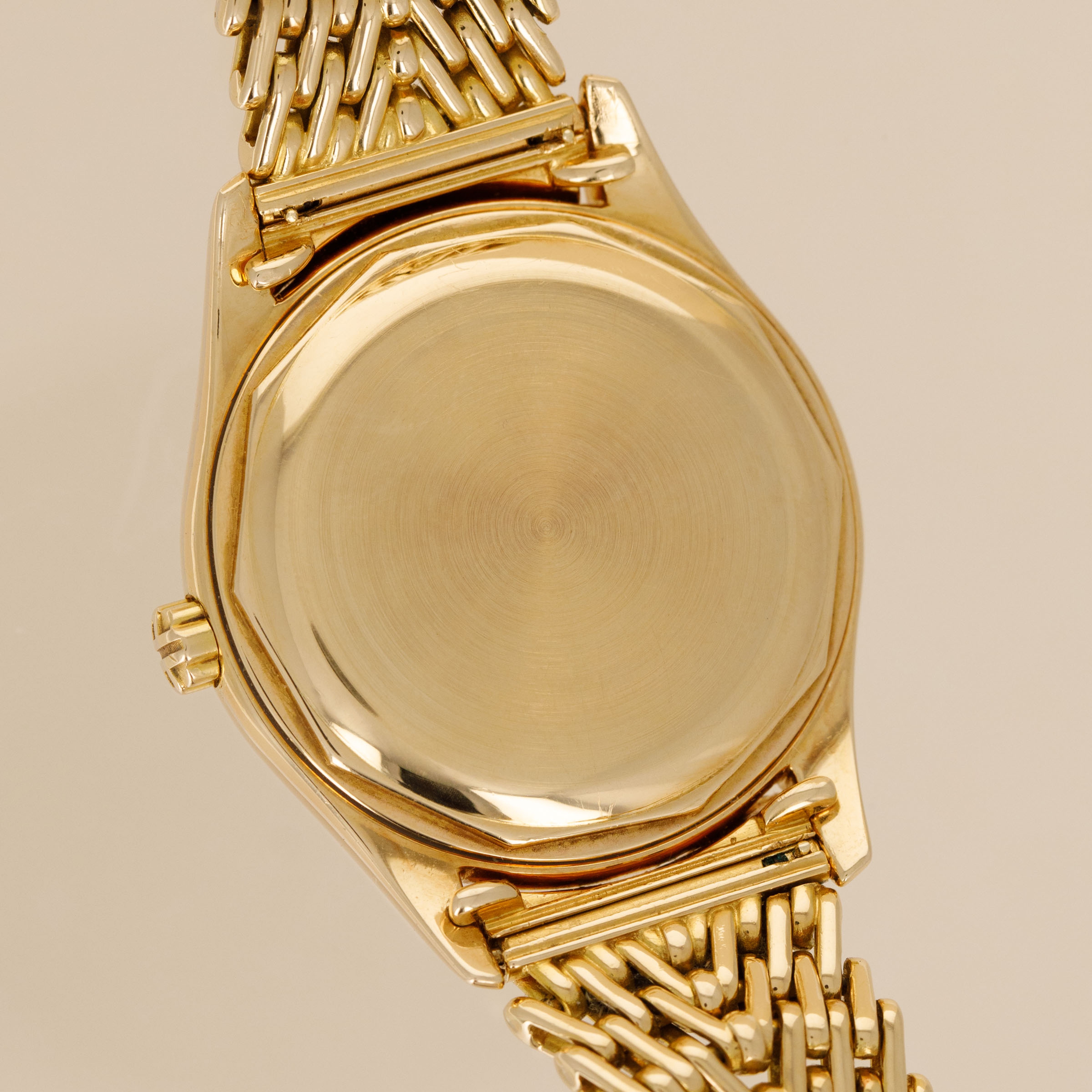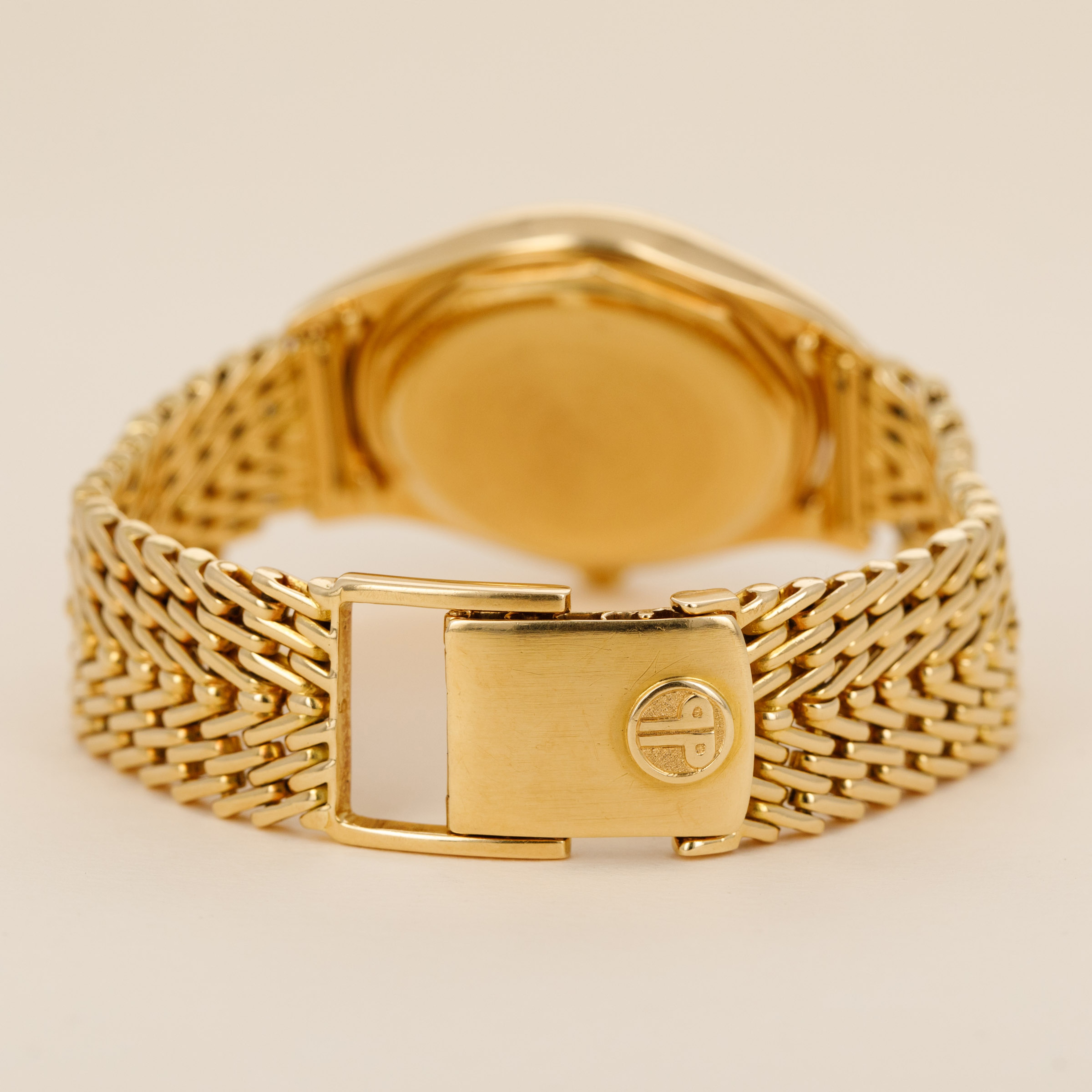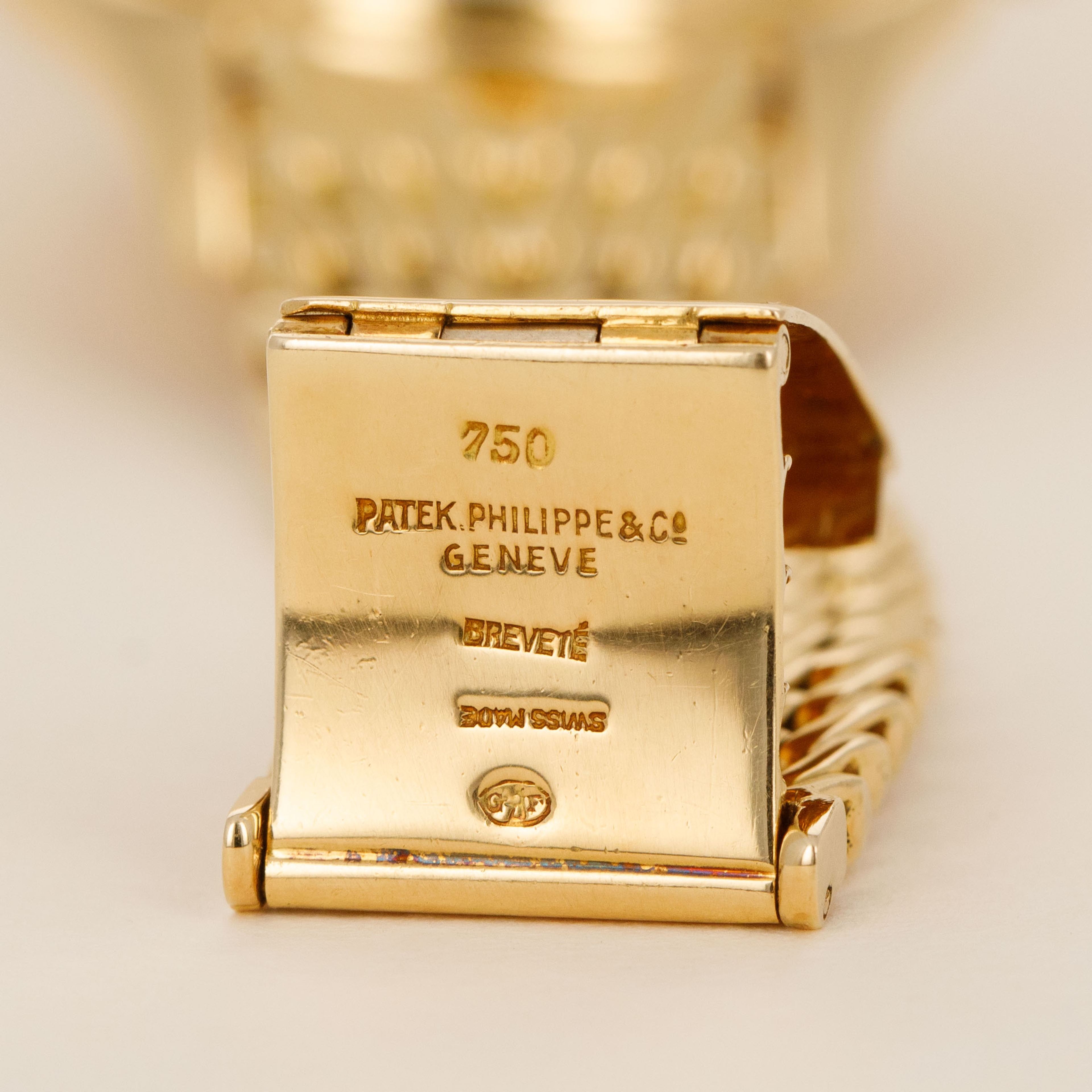 Watch is in overall excellent condition. The yellow gold case shows some light scratches and marks consistent with its vintage, and the Double-P winding crown remains very well defined. The enamel dial is near mint, with crisp text and a clearly visible Gübelin signature. There are no hairlines or visible fissures on the dial surface. The yellow gold hands have some light scratches. It is fitted with a yellow gold GF made Patek Philippe bracelet with signed clasp, showing light surface marks. Fits approximately a 7 1/4” wrist. Comes with its original box and Extract from the Archives.