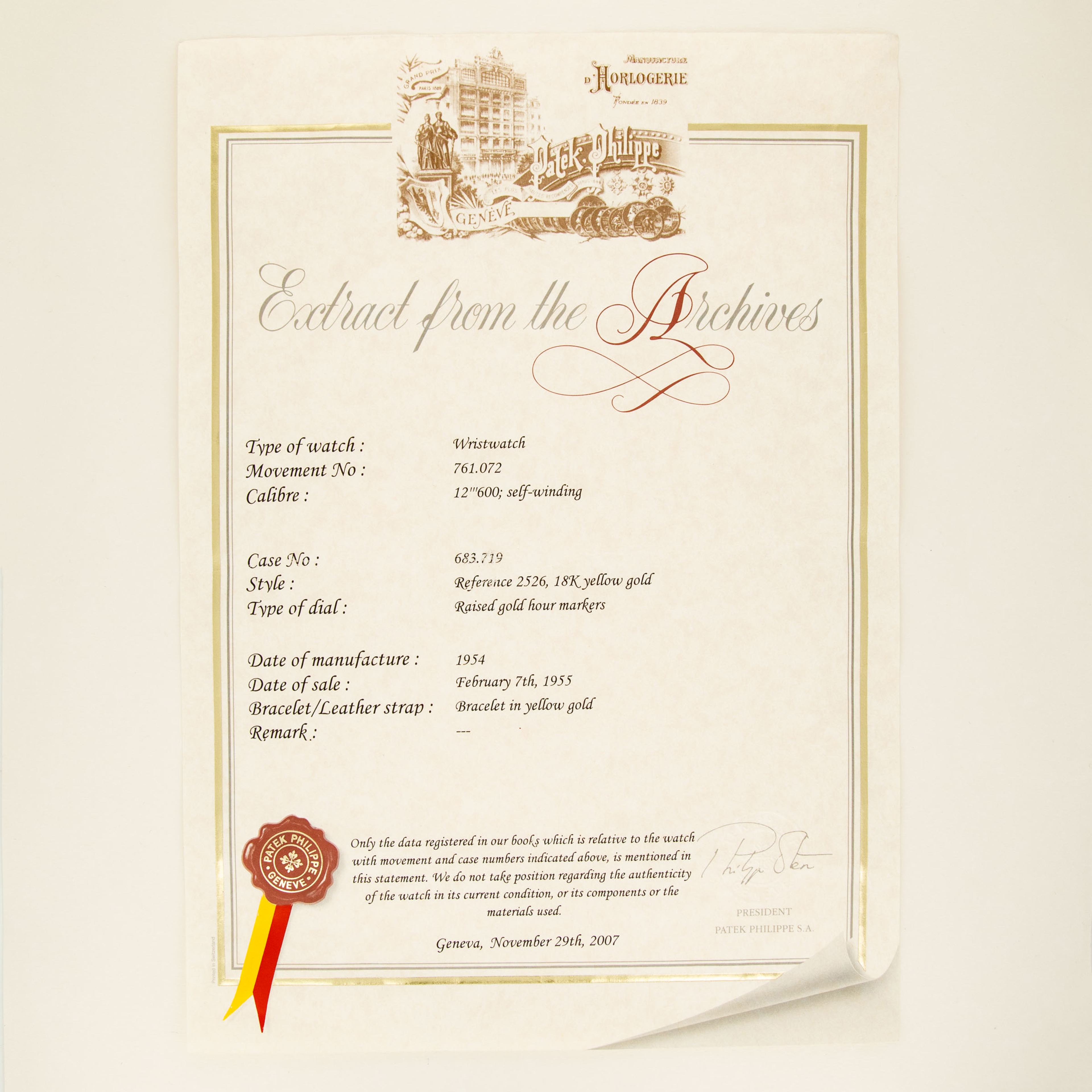 Offered as the peak of technology for the time, the ref. 2526 also featured a screw-down caseback that granted a significant amount of water resistance to the model at the time – a large upgrade for a dress watch. Additionally, the ref. 2526 features a large, for the time, 36mm case that offers a wonderfully contemporary touch to the collection’s original 31mm case, as used by the ref. 96, which added to its ahead-of-its-time movement and screw-down caseback. Offered with its original 18kt yellow gold V-shaped bracelet made by Gay Freres, this ref. 2526 maintains a direct link back to its past through its Gubelin stamp that adorn its dial just below its central hand pinion and marks who originally retailed the watch all the way back on the 7th of February in 1955, as referenced by its Extract from the Archive.