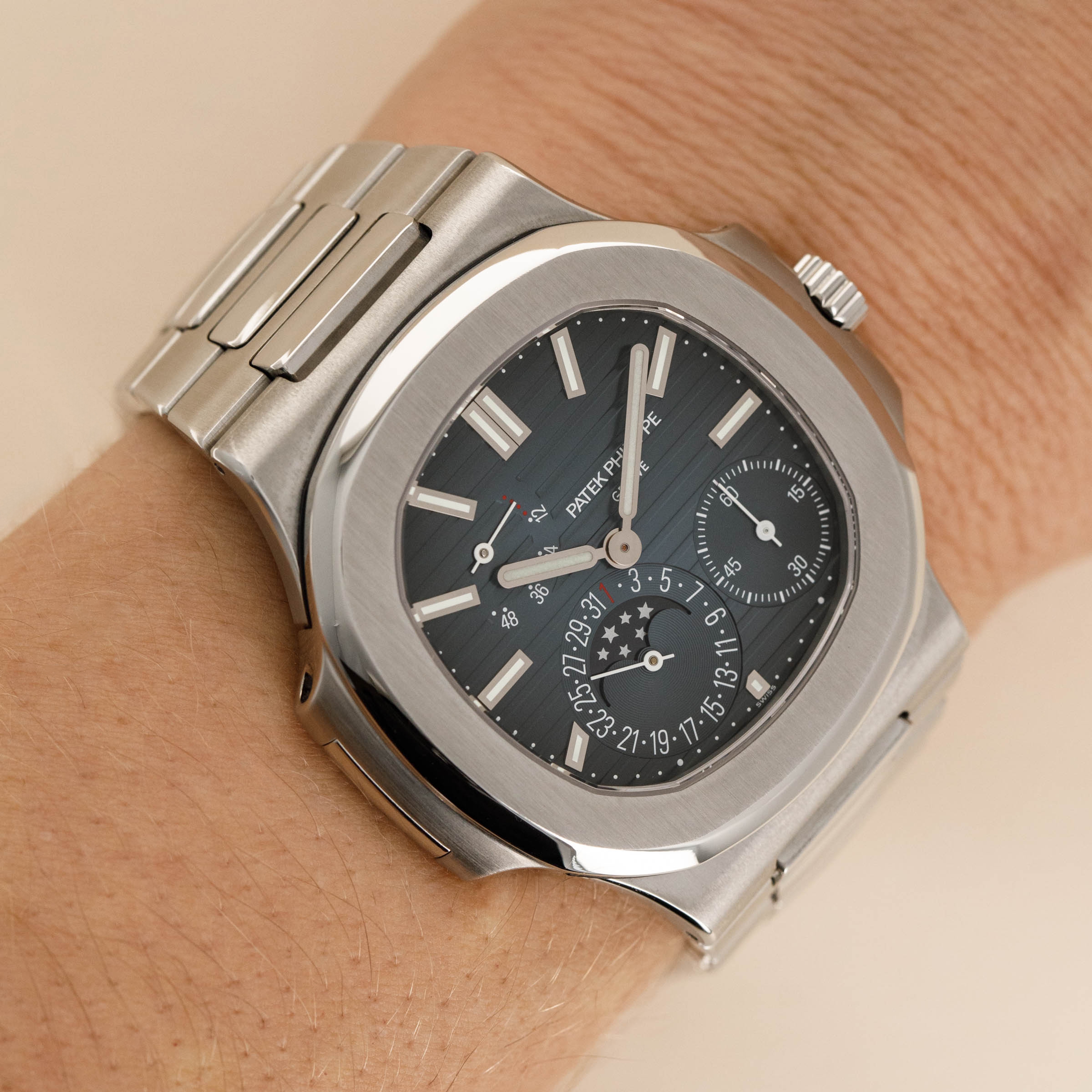 Featuring the Nautilus' typical dial DNA, the ref. 5712 sports a blue to black gradient alongside horizontal embossing that combine to create a familiar aesthetic. However, with its off-center pointer date and moonphase indicator, power reserve indicator, and running seconds subdial, it is a wonderfully unique dial indeed.