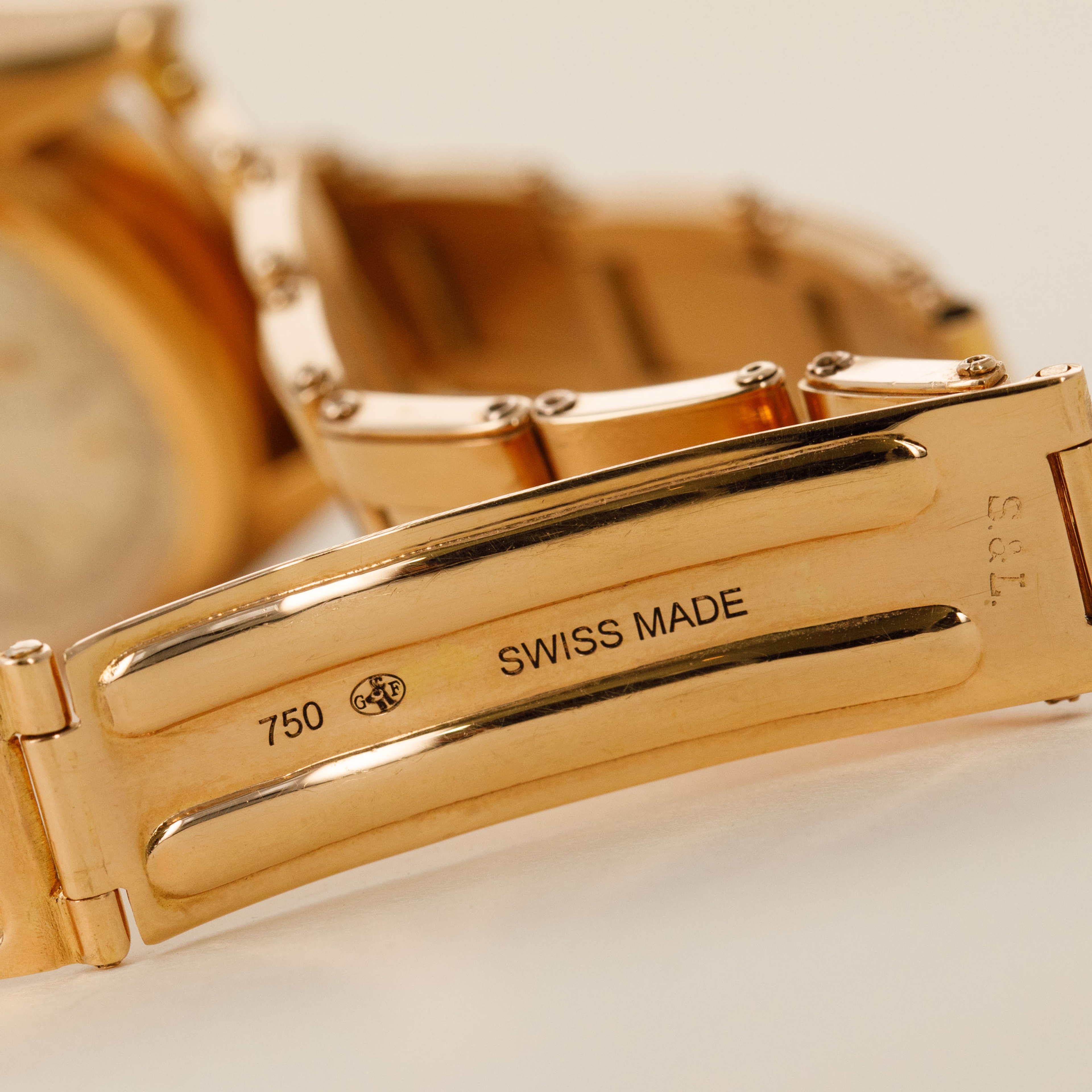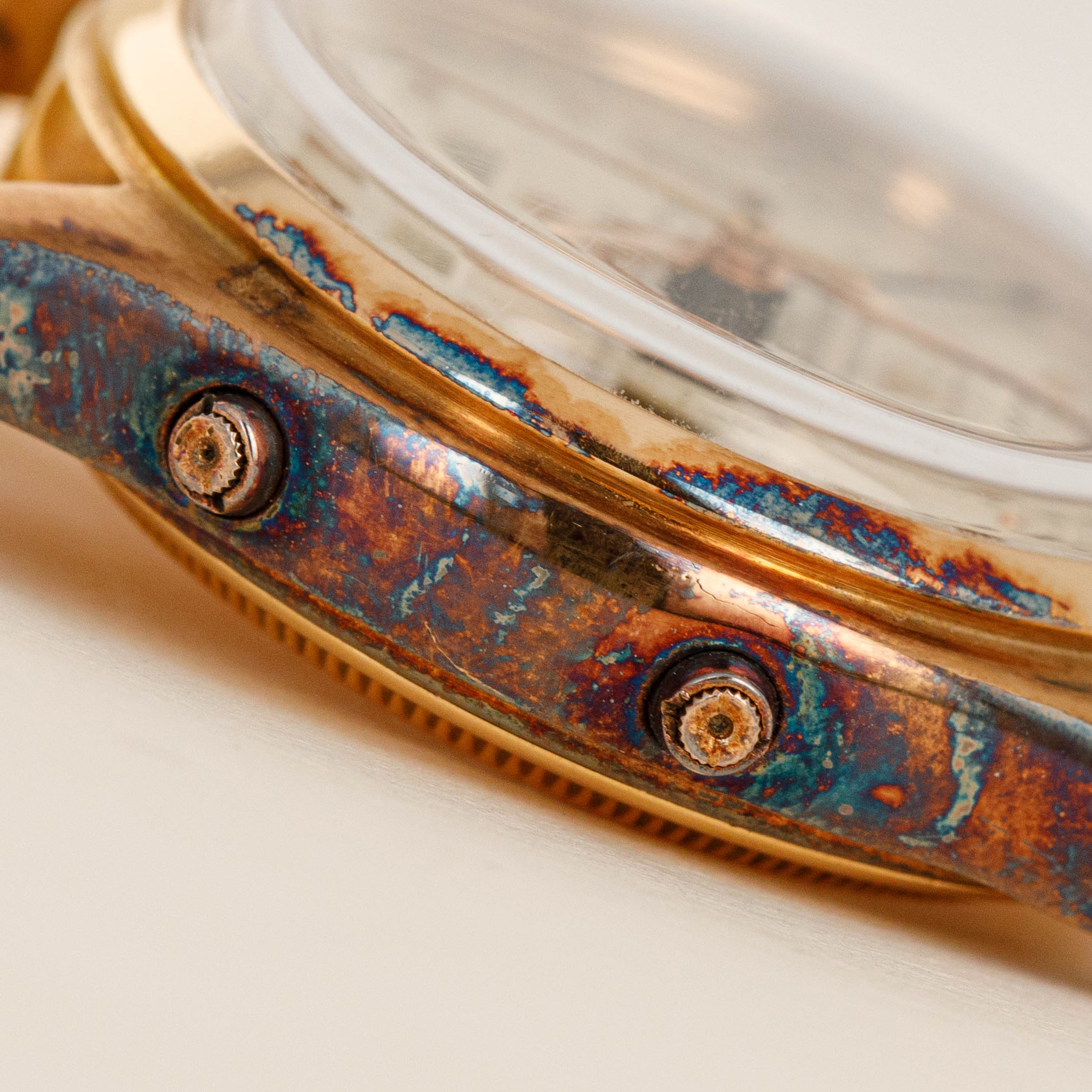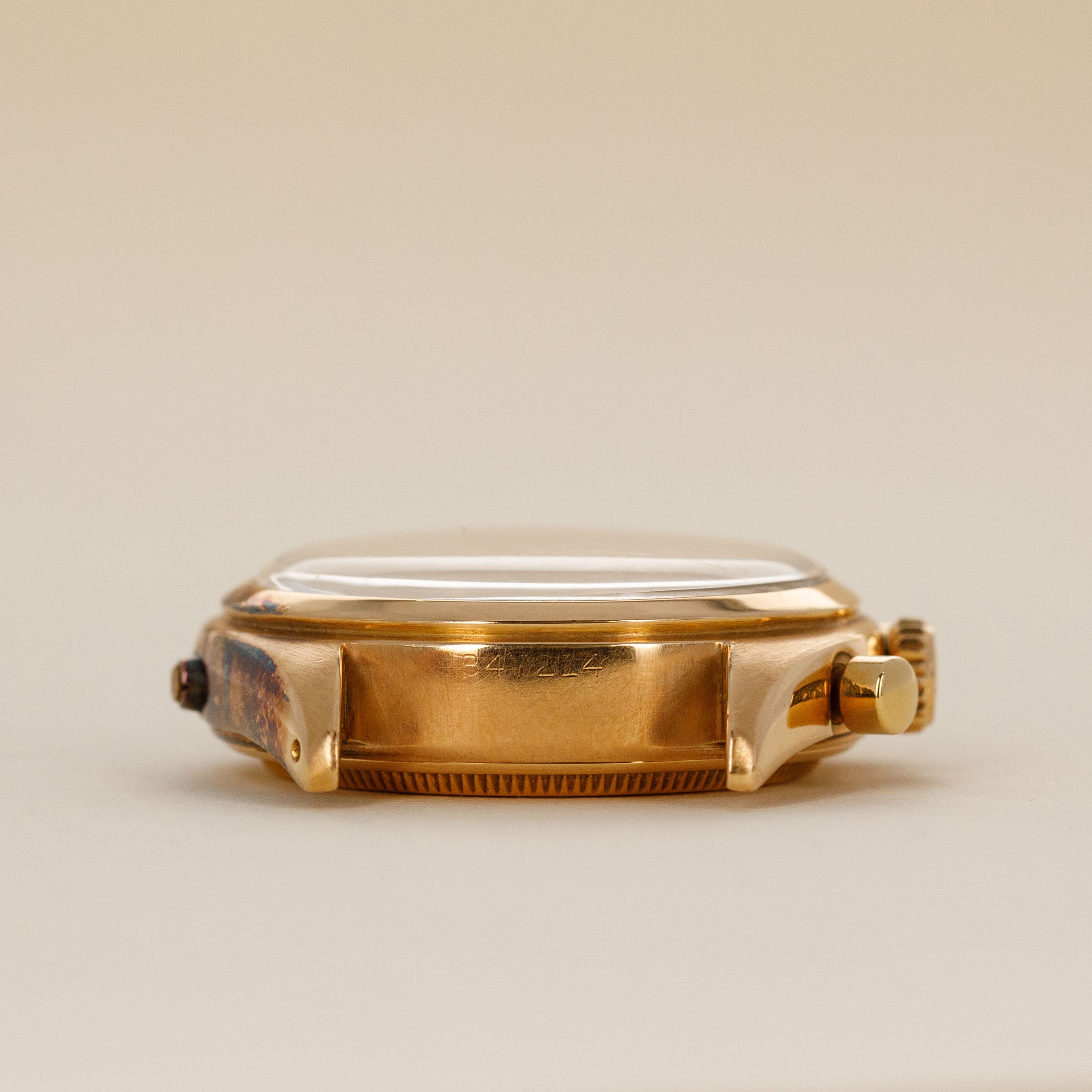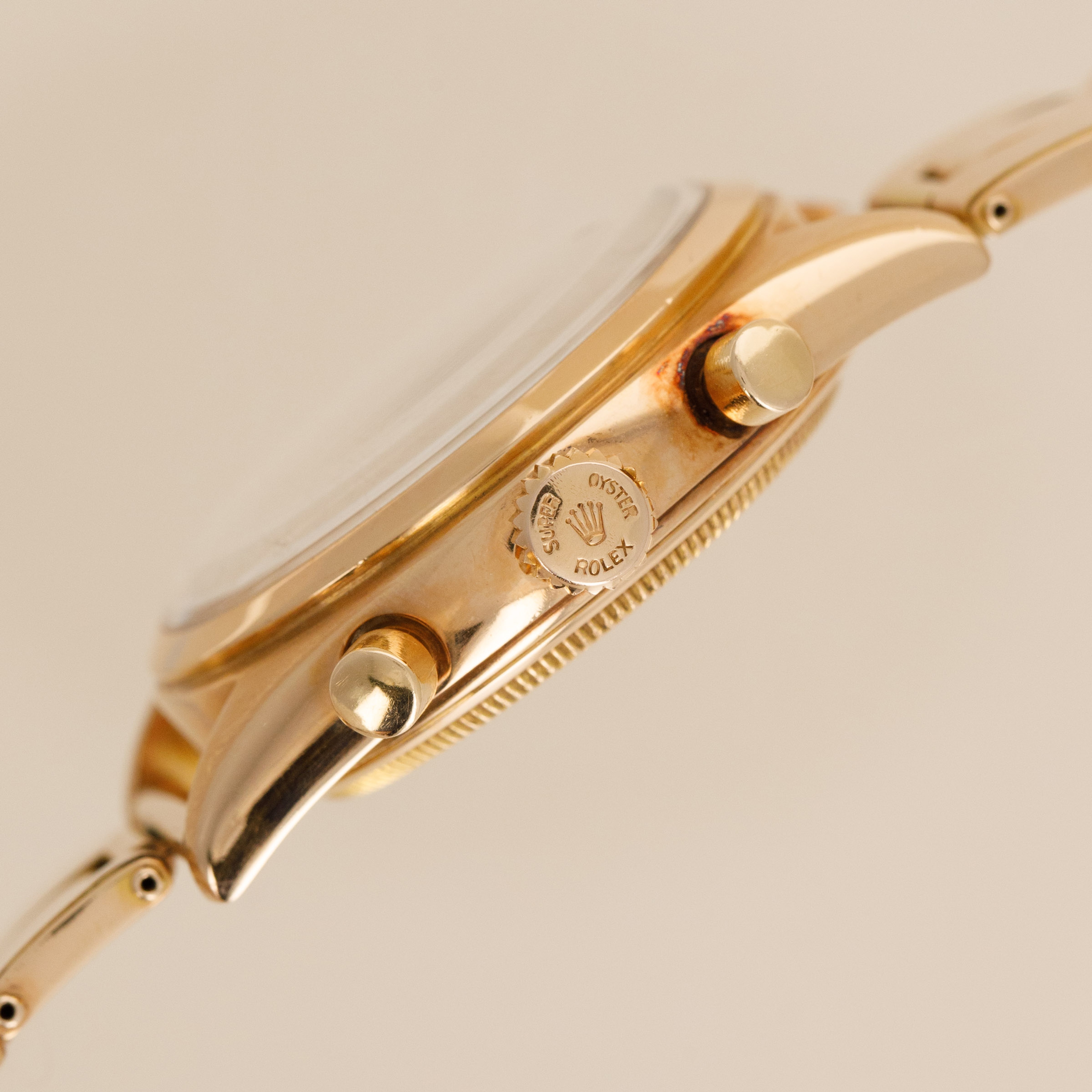 Watch is in overall excellent condition. The rose gold case shows light marks and scratches as expected of a watch of this vintage, with some oxidation present in areas. The outer case back retains its original reference and gold stamps, and there is a clearly legible hallmark on the back of the lower right lug. The correct Super Oyster non-screwdown crown is present, along with excellent pushers and correctors. The dial has some surface spotting and visible degradation at the edge at six, but the text, including the SERPICO Y LAINO signature, remains intact. The watch is fitted with a rose gold straight endlink Oyster-style Gay Frères rivet-link bracelet that is excellent, with some surface scuffs and light play between the links. The clasp bears the S&L stamp on the inner blade. The bracelet has 13 links and fits approximately a 7 3/4” wrist.