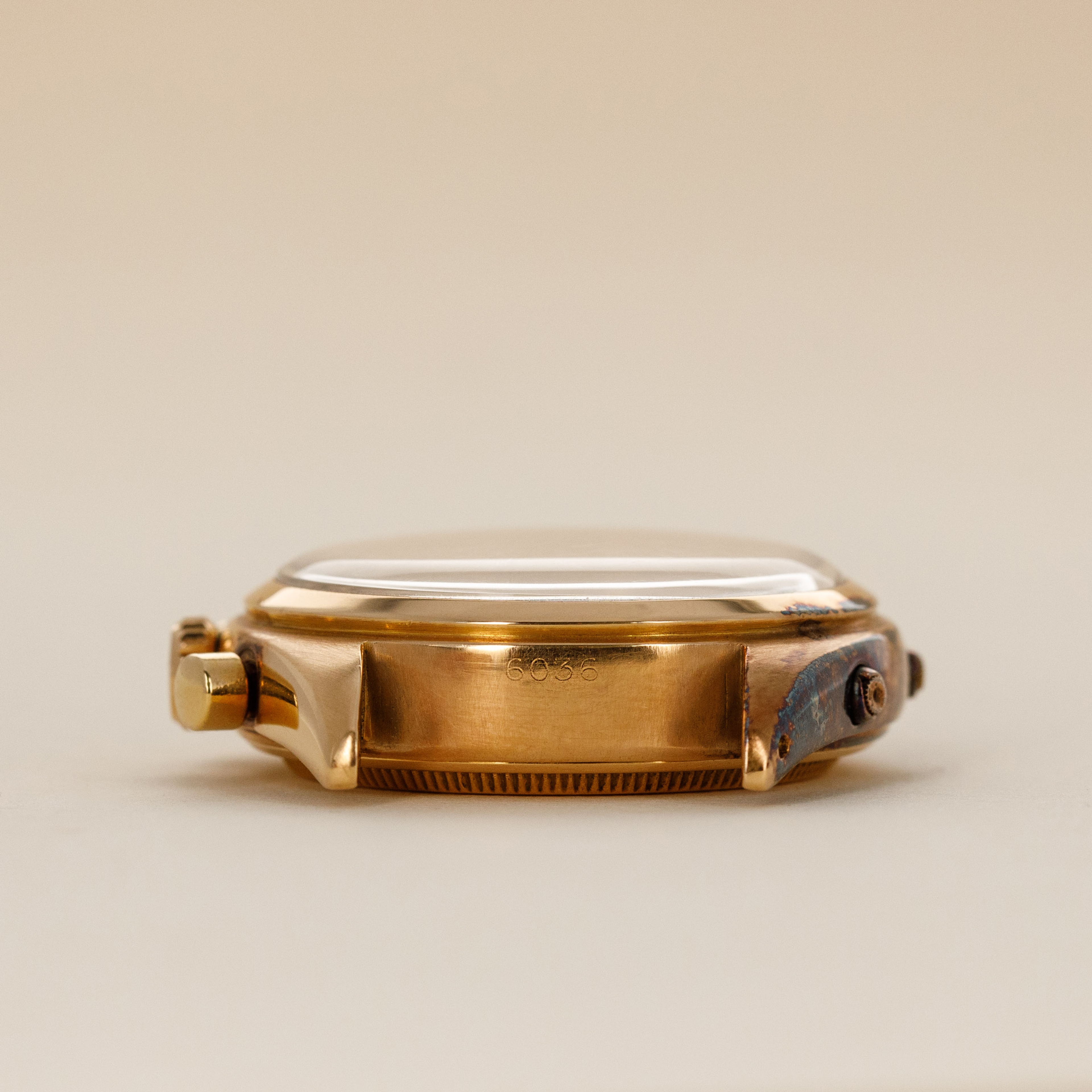 Produced in the early 1950s, the 6036 belongs to a rare group of Rolex watches combining day, date, month, chronograph, and moonphase indications. This level of complexity was unusual for Rolex, whose philosophy favored clarity and reliability. The watch was offered in stainless steel, yellow gold, and pink gold, featuring elegant dials with applied markers, dauphine hands, and carefully balanced calendar apertures.